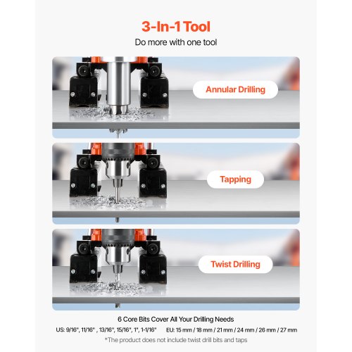 VEVOR Magnetic Drill Press Mag Drill Press 1400 W 0-750 RPM with 6 Core Bits<br/>Built-In Overload Protection<br/>Clear Scale Marking<br/>No-Shake Strap<br/>Stable Drilling on Any Surface<br/>Sturdy Magnetic Base<br/>Continuous Cool Operation<br/>Fuse: 15 A,Unit Weight: 26 lbs / 11.8 kg,Hole Diameter (hollow drill): 1.97 in / 50 mm,Tapping Diameter: 0.12–0.63 in / M3–M16,Max. Stroke: 8.66 in / 220 mm,Direction of Rotation: Forward / Reverse,Item Model Number: MD-50E,Max. Power: 1400 W,Magnetic Attraction: 2248 lbf / 10000 N,Twist Drill Diameter: 0.12–0.63 in / Φ3–Φ16 mm