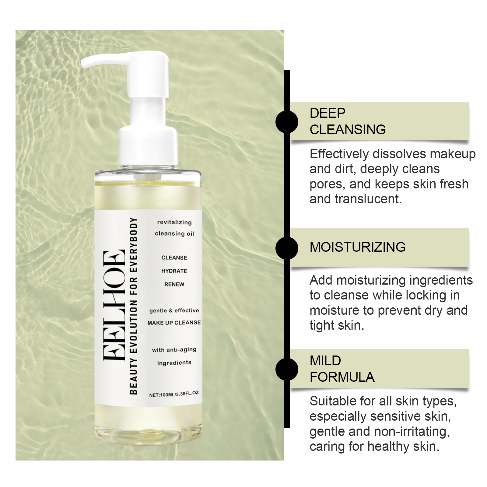 Our gentle cleansing oil contains mineral oil, laureth-4. It gives a refreshing texture, does not clog pores, prevents pimples and blemishes, and keeps skin clean. Its use method is very simple: 1. Apply appropriate amount of this product evenly on dry face skin; 2. Gently massage the entire face to ensure that the makeup is completely dissolved; 3. Finally rinse with water. Clean thoroughly, leaving no oil residue, leaving skin fresh and comfortable.