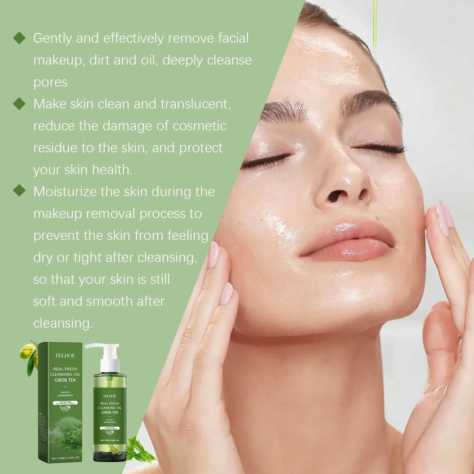 Our green tea cleansing oil contains tocopherol (vitamin E), tea extract. Its oil-rich formula helps to remove dead skin from the surface of the skin and improve skin texture. Dissolves cosmetics effectively, cleans easily, and keeps skin fresh. The way to use it is simple: wash it with clean water and keep it dry. Massage gently in a circular motion for 1-2 minutes. Apply appropriate amount to face. And thick high viscosity, bring soft touch, make the makeup removal process pleasant.