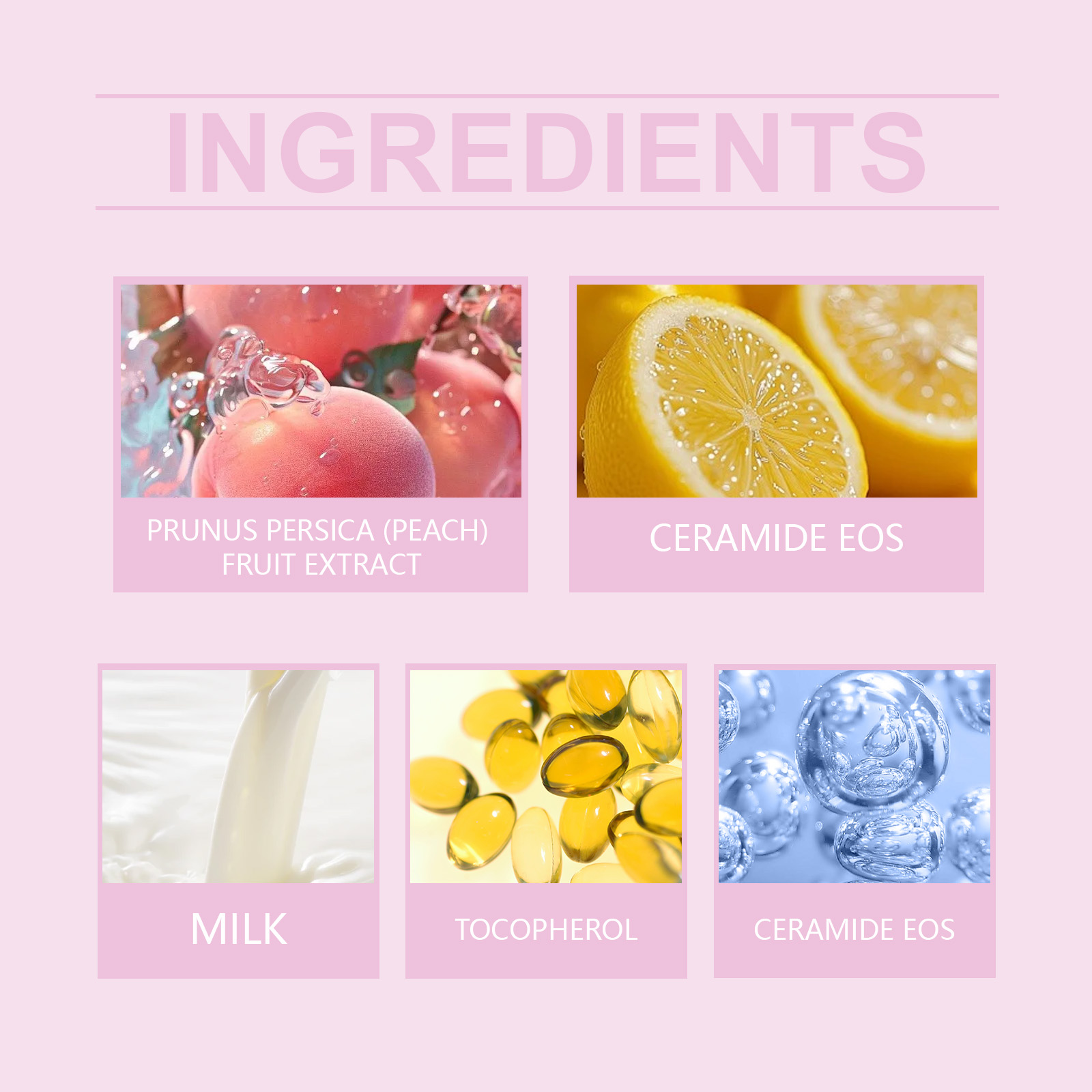 Our peach makeup remover contains tocopherol (vitamin E) and lemon fruit extract. It can completely remove facial makeup. Its use method is very simple: apply appropriate amount of this product evenly on dry facial skin; Gently massage the entire face to ensure that the makeup is completely dissolved; Finally rinse with water. It can effectively dissolve makeup and dirt, deeply clean pores, and keep skin fresh and bright.
