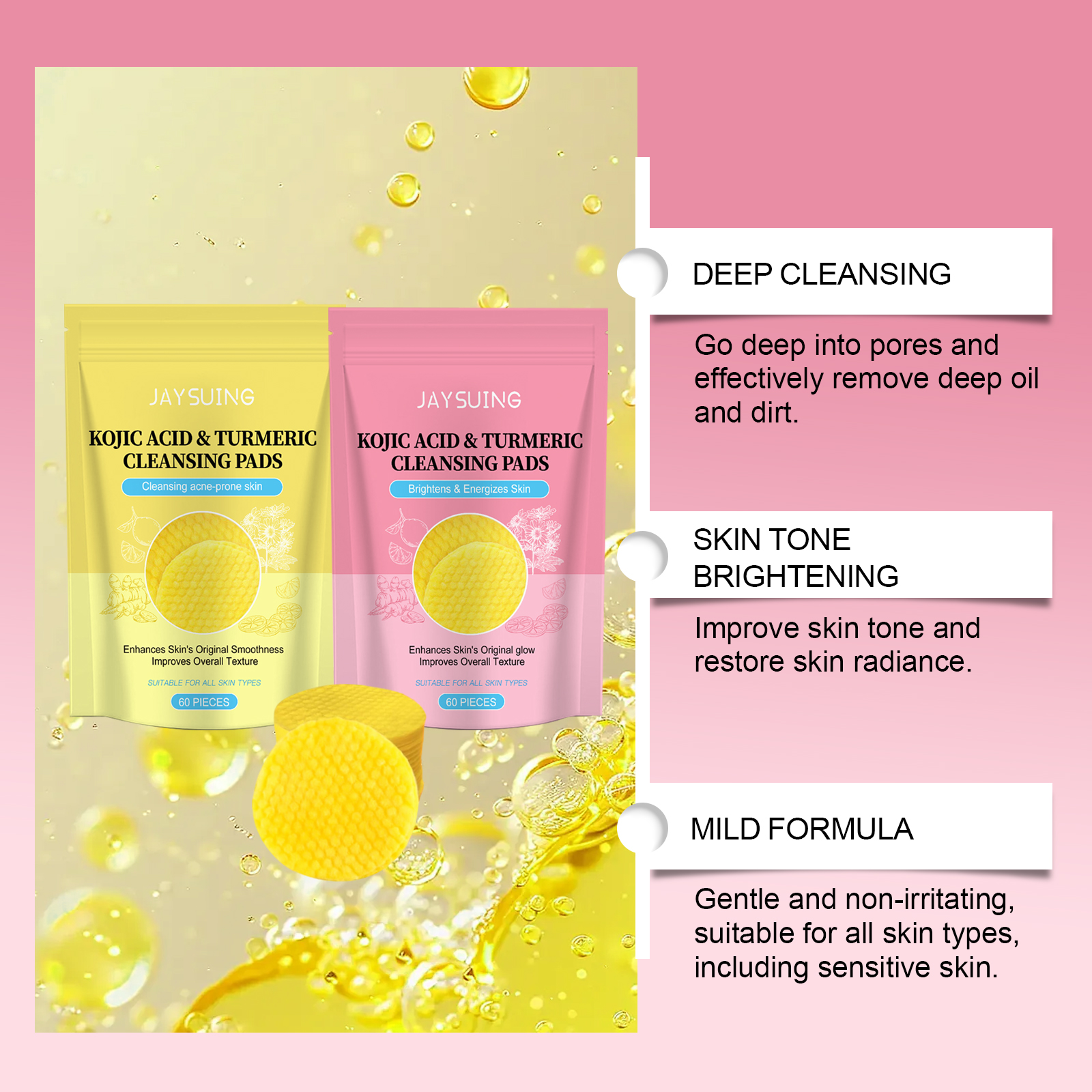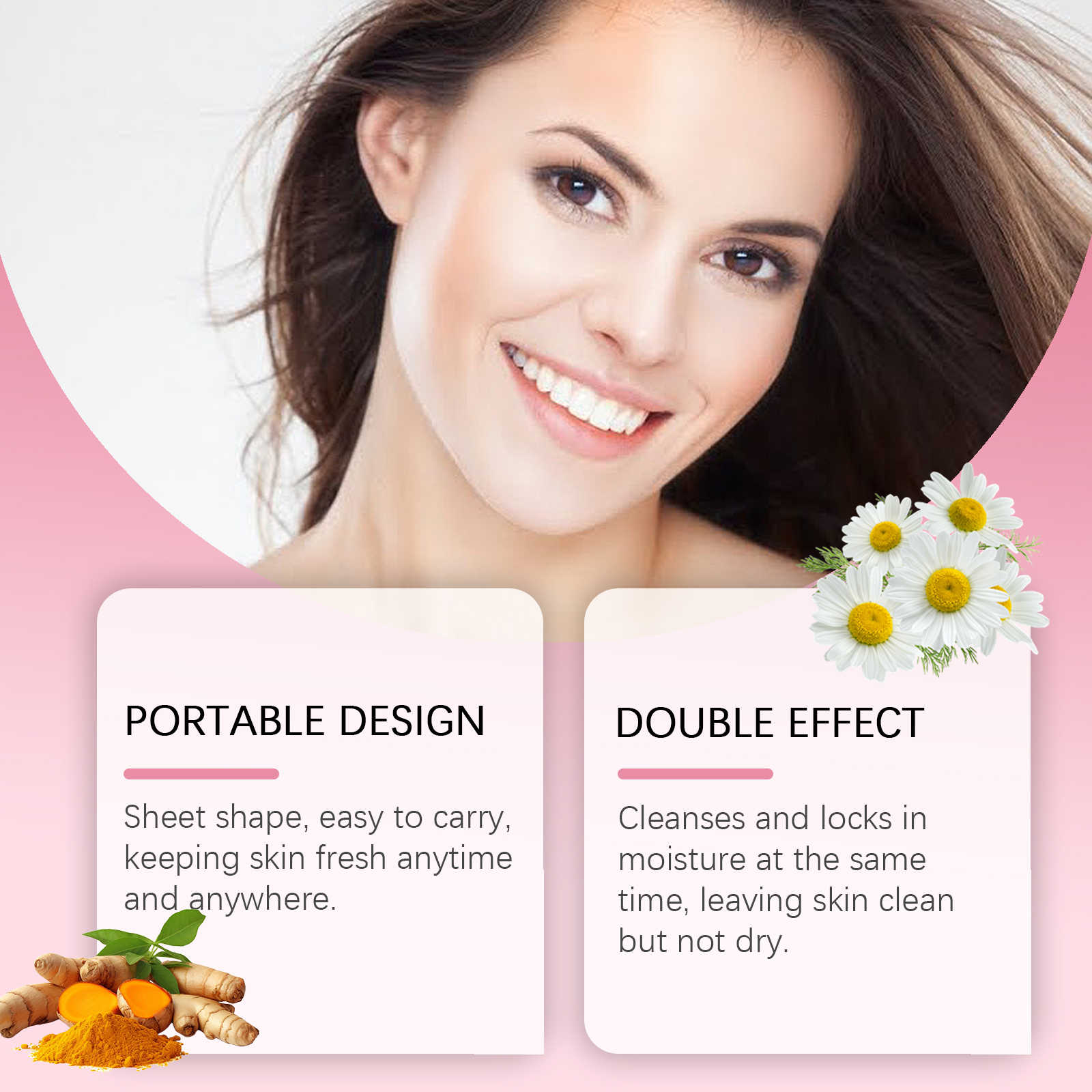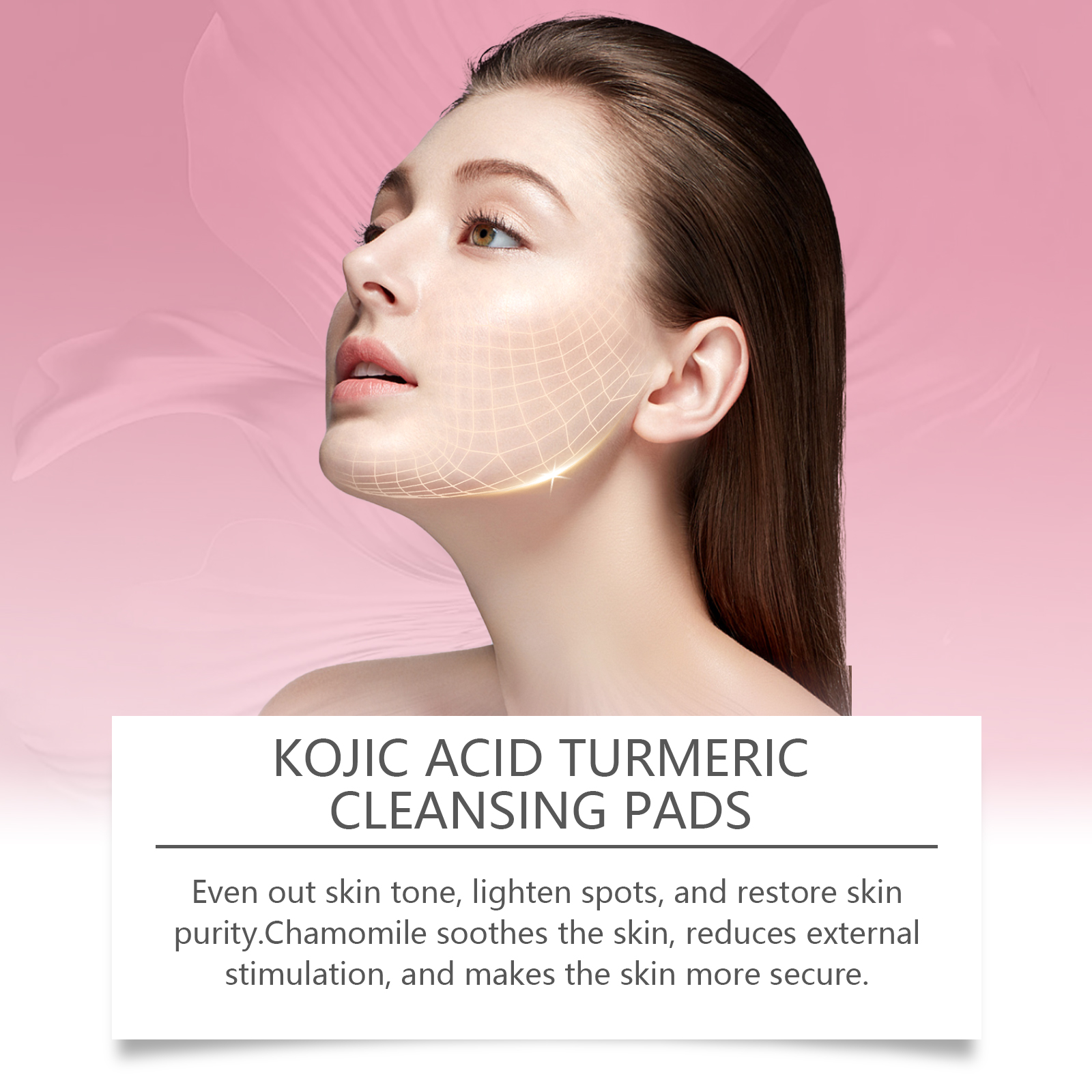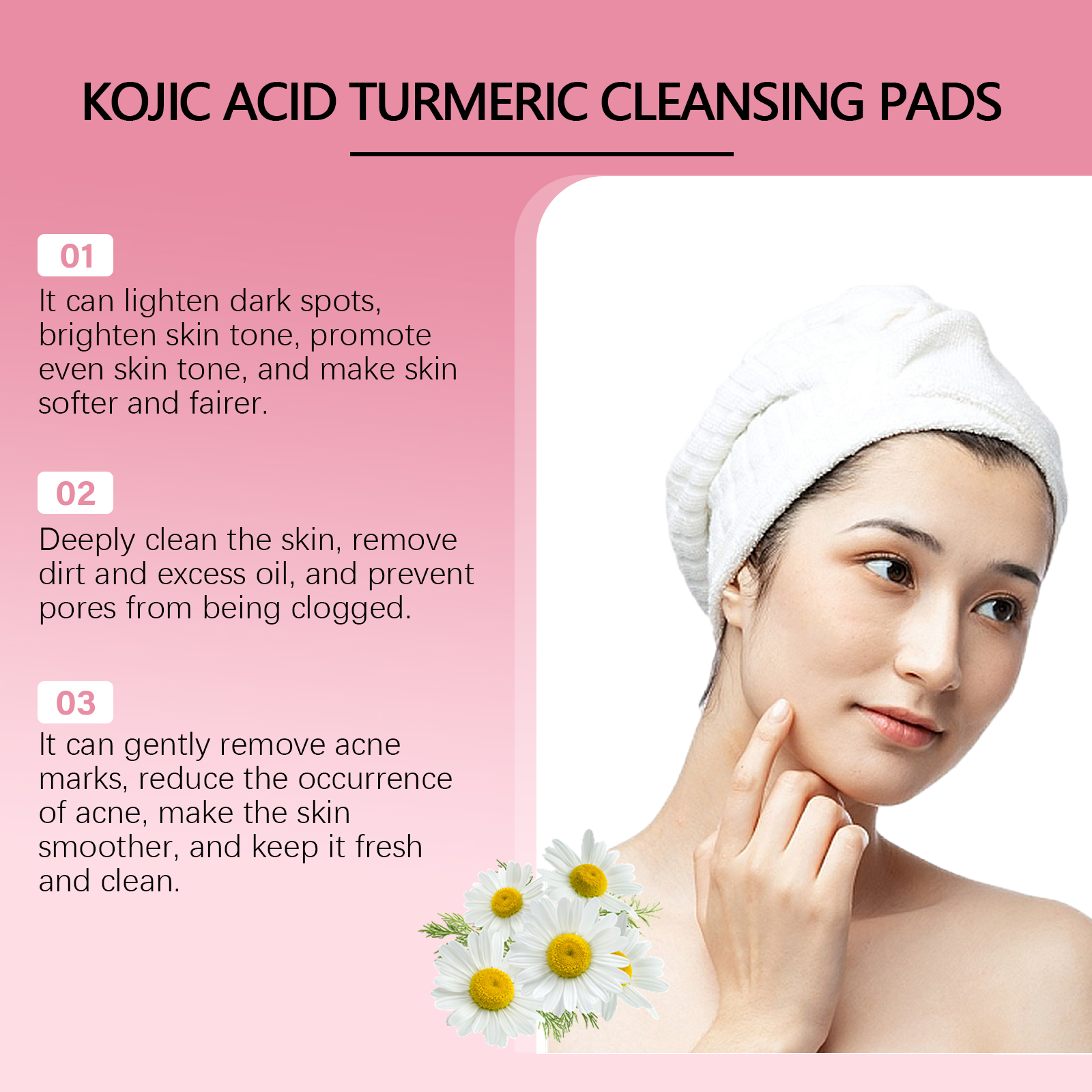 Our kojic acid turmeric Rejuvenation cotton tablets contain nicotinamide and lemon extract. It cleans and locks in moisture, keeping skin clean and not dry. Its use is simple: cleanse and moisturize facial skin; Massage the mat onto your face in circular motions with warm water; Rinse well with water. And can lighten the skin tone, fade spots, restore pure skin. Chamomile soothes the skin, reduces external irritation and makes the skin feel more secure.