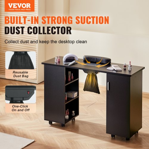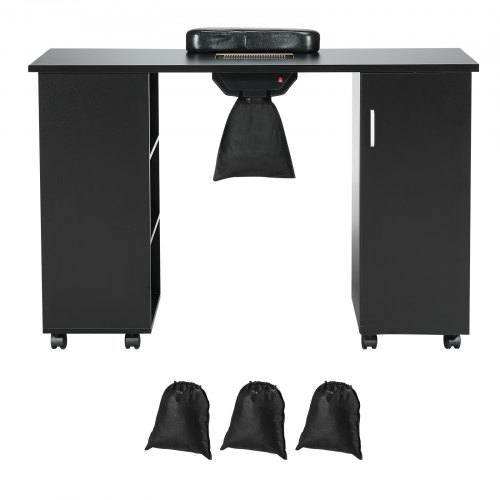 VEVOR Manicure Table, Nail Table Station with Electric Dust Collector, Moveable Nail Tech Desk with 8 Wheels (4 Lockable), 3 Dust Bag & Wrist Rest, MDF Nail Art Workstation for Spa Beauty Salon, BlackHigh Quality MDFEasy to MoveErgonomic DetailsHigh ComfortLarge Storage SpaceWide ApplicationsColor: Black,Item Model Number: MT-245,Number of Wheels: 8,Product Dimensions: 47.2'' x 17.7'' x 33.5'' / 1200 x 450 x 805 mm,Net Weight: 73.9 lbs / 33.5 kg,Power: 6W,Main Material: MDF (Medium-Density Fiberboard)