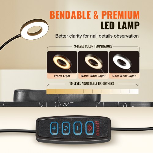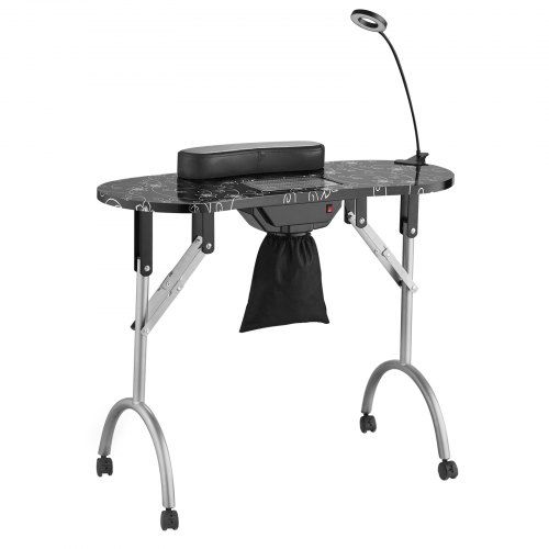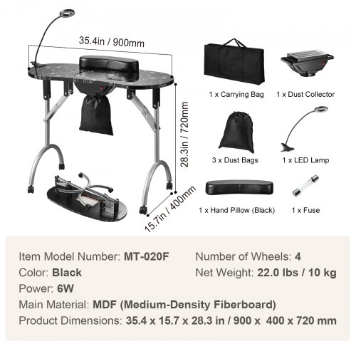 VEVOR Portable Manicure Table, Foldable Nail Table with Electric Dust Collector, Moveable Nail Tech Desk & 4 Wheels, 3 Dust Bags, Bendable LED Lamp, MDF Nail Art Workstation for Home Spa Beauty SalonHigh Quality MDFEasy Folding10 Levels of BrightnessHigh ComfortLarge Storage SpaceWide ApplicationsColor: Black,Item Model Number: MT-020F,Number of Wheels: 4,Product Dimensions: 35.4 x 15.7 x 28.3 in / 900 x 400 x 720 mm,Net Weight: 22.0 lbs / 10 kg,Power: 6W,Main Material: MDF (Medium-Density Fiberboard)