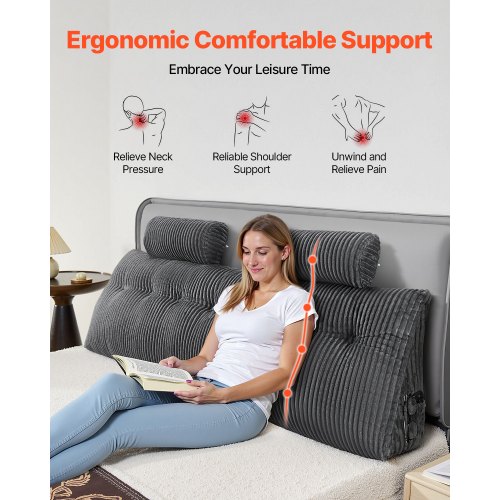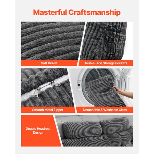 VEVOR Headboard Pillow, King Size Wedge Headboard Pillow with 2 Side Pockets and 2 Headrests, Bed Wedge Pillow with Washable Flannel Cloth, for Reading, Gaming, Resting, Working in Bed, GreySkin-Friendly Ultra-Soft Velvet FabricOrganized Living at Your FingertipsVersatile Head PillowsErgonomic PerfectionVacuum-Sealed ConvenienceIdeal PresentItem Size: 76 x 8 x 21 in / 1920 x 205 x 530 mm,Color: Grey,Item Model Number: SSYDZ-08,Material: Velvet + Fiber Foam,Item Weight: 16 lbs / 7.12 kg
