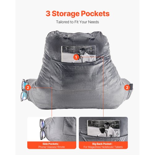 VEVOR Reading Pillow, Large Size Bed Pillow with Shredded Memory Foam, Back Pillow with 3 Pockets and Washable Short Velvet Cloth, Top with Handle, for Watching TV, Reading, Gaming, Resting, GreyPremium Elastic Memory FoamUpgraded Dual-Zipper DesignThree-Pocket DesignExcellent Fit for Shoulders & BackPortability with Thoughtful HandleIdeal PresentItem Size: 15 x 20 x 10 in / 381 x 508 x 254 mm,Color: Grey,Item Model Number: XSHRP002,Material: Velvet + Shredded Memory Foam,Pocket Quantity: 3,Item Weight: 5.9 lbs / 2.68 kg