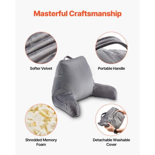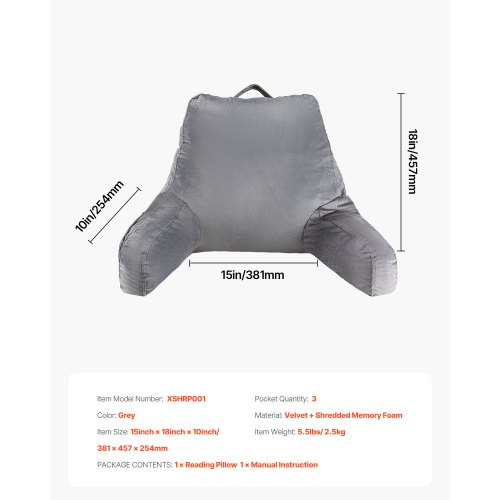 VEVOR Reading Pillow, Standard Size Bed Pillow with Shredded Memory Foam, Back Pillow with 3 Pockets and Washable Short Velvet Cloth, Top with Handle, for Watching TV, Reading, Gaming, Resting, GreyPremium Elastic Memory FoamUpgraded Dual-Zipper DesignThree-Pocket DesignExcellent Fit for Shoulders & BackPortability with Thoughtful HandleIdeal PresentItem Size: 15 x 18 x 10 in / 381 x 457 x 254 mm,Color: Grey,Item Model Number: XSHRP001,Material: Velvet + Shredded Memory Foam,Pocket Quantity: 3,Item Weight: 5.5 lbs / 2.5 kg