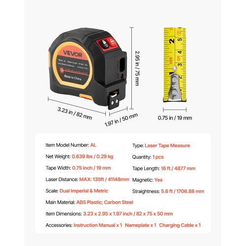 2in1 Laser Tape Measure 135ft Rechargeable Laser 16ft Magnetic Tape<br/>2-in-1 Smart Laser Tape Measure<br/>Multiple Laser Measurement Modes<br/>Two Data Display Options<br/>Compact & Portable<br/>Secure & User-Friendly<br/>Ergonomic Grip Design<br/>Type: Laser Tape Measure,Magnetic: Yes,Tape Length: 25 ft / 7620 mm,Straightness: 5.6 ft / 1706.88 mm,Item Model Number: AL,Quantity: 1 pcs,Laser Distance: MAX: 135 ft / 41148 mm,Scale: Dual Imperial & Metric,Item Dimensions: 3.23 x 2.95 x 1.97 inch / 82 x 75 x 50 mm,Net Weight: 0.639 lbs / 0.29 kg,Tape Width: 0.75 inch / 19 mm,Main Material: ABS Plastic; Carbon Steel