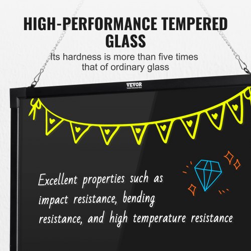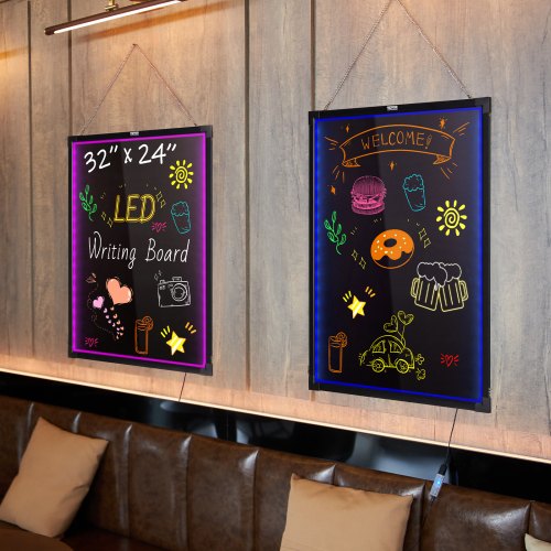 VEVOR LED Message Writing Board, 32"x24" Illuminated Erasable Lighted Chalkboard, Neon Effect Menu Sign Board, Drawing Board with 8 Fluorescent Chalk Markers and Remote Contro Tested toStandards16 Colors+4 Modes+5 Brightness LevelsMultiple Charging OptionsInfrared Remote ControlSuperior Performance With Tempered GlassEasy To Clean And HygienicWidely Used In Commercial SettingsLamp Bead: RGB5050,Lamp Bead Color: RGB,Working Voltage: DC12V/1A,Item Model Number: A68 (Hangable and Rise-fall) 6080,Power Supply Method: ① AC 110-220V Plug/USB ② Power Bank/Battery Box,Net Weight: 11.06 lbs / 5.02 kg,Main Material: Aluminum Alloy & Tempered Glass,Product Size: 23.54x31.41x0.35 inch/ 598x798x9 mm