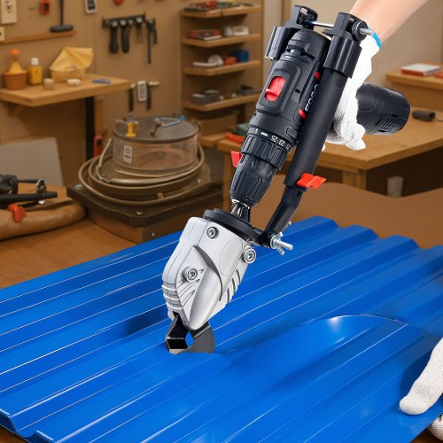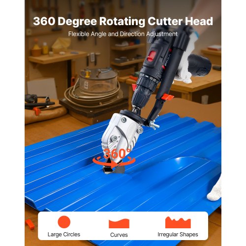 VEVOR Metal Shear/Cutter Drill Attachment, Sheet Metal Cutter with 360-Degree Pivoting Head, Sharp Blades,Ideal for 18 GA Galvanized Steel, 20 GA Stainless Steel, Aluminum Plate, Plastic, Cardboard<br/>Versatile Cutting Accessory<br/>Wide Material Compatibility<br/>Accurate & Clean Cutting<br/>360° Flexible Angle Control<br/>Easy Installation<br/>Reliable Performance<br/>Body Bracket Material: Nylon,Color: Silver Head + Black Body,Item Model Number: DR12,Item Dimensions: 14.37 x 4.45 x 3.15 in / 365 x 113 x 80 mm,Cutter Head Material: Steel,Net Weight: 1.94 lbs / 0.88 kg,Max Cutting Capacity: 18 GA Galvanized Steel, 20 GA Stainless Steel,Cutting Head Rotation: 360°