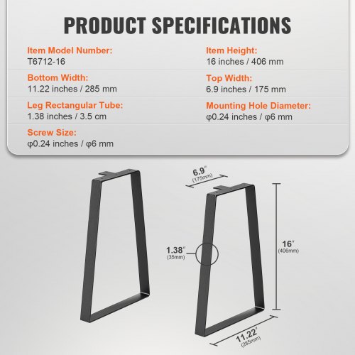 VEVOR 16 inch Trapezoid Steel Table Legs, Replacement Furniture Legs Set of 2 for DIY Coffee Tables, Modern Desks, Bench, Night Stands, Sofa, Max Load 400 lbs Heavy Duty, Quick Instalation Legs BlackHigh-Quality and DurableStrong Load-Bearing and AdjustableUpgraded Mounting PlateVersatile for Multiple SettingsImportant GuidelinesPrimary Material: Carbon Steel,Screw Size: ST0.14 x 1.18 inches / ST3.5 x 30 mm,Mounting Hole Diameter: φ0.24 inches / φ6 mm,Maximum Load: 400 lbs / 181 kg,Item Height: 16 inches / 406.4 mm,Item Model Number: T6712-16,Top Width: 6.9 inches / 175 mm,Bottom Width: 11.22 inches / 285 mm,Leg Rectangular Tube: 1.38 inches / 3.5 cm,Item Weight: 5.73 lbs / 2.6 kg