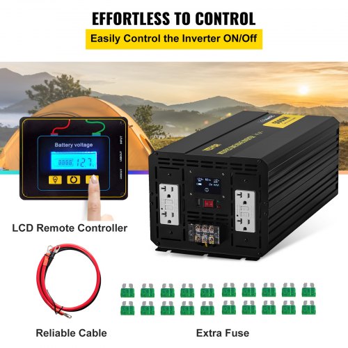 VEVOR Power Inverter, 5000W Modified Sine Wave Inverter, DC 12V to AC 110V Car Converter, with LCD Display, Remote Controller, LED Indicator, GFCI Outlets Inverter for Truck RV Car Boat Travel CampingSturdy Aluminum AlloyLCD Screen & LED IndicatorsEffortless to ControlMultiple Protection DesignsIntelligent Fan CoolingVarious ApplicationDC Input Voltage: 12V DC,Continuous Power: 5000W,AC Output Voltage: 115 VAC ± 5%,Plug Type: US Socket(GFCI),Product Size (L x W x H): 440 x 207 x 165 mm/17.32 x 8.15 x 6.5'',Surge Output Power: 10000W,Model: GYM-5000W,Over-voltage Protection: 16V,Features: LCD Display,Under-voltage Protection: 10.5V,Output Waveform: Modified Sine Wave,Output Frequency: 60 Hz ± 1 Hz
