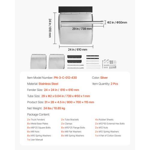 Stainless Steel Quarter Fenders for Semi Trucks 24"x24" with Tube BracketHigh Quality Stainless SteelPremium Rubber SheetsKeep CleanWidely CompatibleUser-Friendly DesignSleek AestheticItem Quantity: 2 Pcs,Color: Silver,Item Model Number: PN-3-C-012-430,Fender Size: 24 x 24 in / 610 x 610 mm,Tube Size: 29 x Φ2 x 0.04 in / 739 x Φ50 x 1 mm,Material: Stainless Steel,Net Weight: 24 lbs / 10.85 kg,Product Size: 31 x 28 x 4.5 in / 800 x 700 x 115 mm
