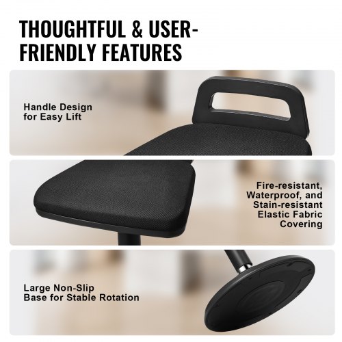 VEVOR Active Chair with Handle, Height-Adjustable (24.6-34.4") Wobble Chair Made of Elastic Fabric & 45 mm Foam, Ideal for Schools, Office and Home, 8° Tilt Angle, BlackFlexible Active Chair360° Rocking DesignStrong Weight CapacityExcellent GripVersatile UseEasy Assembly and MobilityHeight Adjustment: 24.6-34.4 in / 62.5-87.5 cm,Weight Capacity: 264.6 lbs / 120 kg,Color: Black,Product Model: Allen570,Material: Elastic Fabric + Molded Foam + ABS + Iron + TPR + Nylon Fiber,Product Dimensions: 15.7 × 15.7 × (24.6-34.4) in / 400 × 400 × (625-875) mm,Net Weight: 14.3 lbs / 6.5 kg,Tilt Angle: 8°