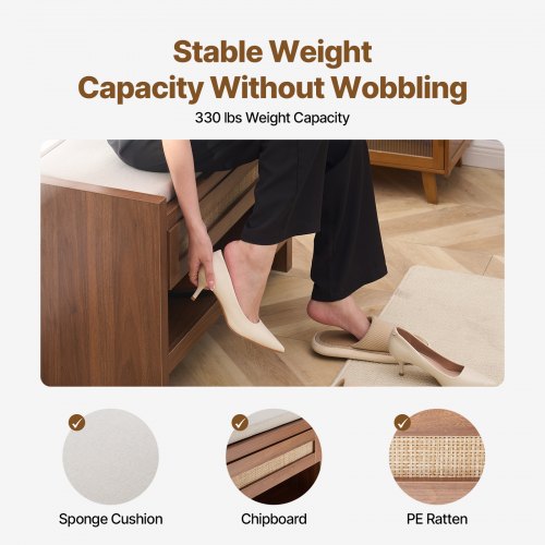 VEVOR Rattan Bench, 30.9" Rattan Shoe Bench, Entryway Bench with Storage Drawer and Linen Seat Cushion, Farmhouse Boho Bench with Hand Woven Rattan, for Entryway, Bedroom, Living Room, KitchenHandwoven StylePremium MaterialsMulti-Layer Storage SpaceEasy AssemblyVersatile DesignThoughtful DetailsWeight Capacity: 330 lbs / 150 kg,Foot Pads: Non-Slip Foot Pads,Color: Brown,Seat Surface Matreial: Linen Sponge + Sponge Cushion,Item Model Number: HYXD-04,Frame Material: PB,Product Dimensions: 30.9 x 14.7 x 19.7in / 786 x 374 x 500mm,Layer: Three Layers (Top, Drawer, and Storage Layer),Net Weight: 35.1 lbs / 15.9 kg,Ratten Materal: Plastic Rattan