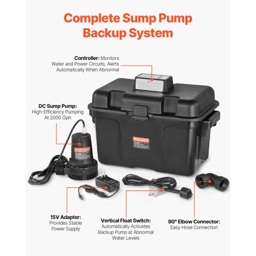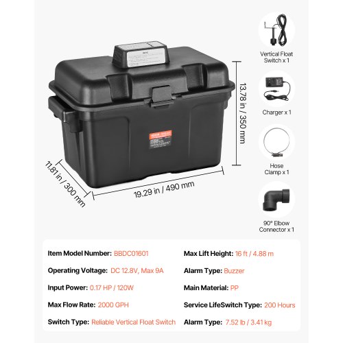Basement Emergency Back-Up Sump Pump Backup Sump Pump System 2000GPH 0.17 HPSecure & EfficientAutomatic Start & StopIP68 Waterproof DesignThoughtful DesignVersatile ApplicationLoud AlarmService Life: 200 Hours,Alarm Type: Buzzer,Product Dimension: 19.29x11.81x13.78 in / 490x300x350 mm,Operating Voltage: DC 12.8V, Max 9A,Input Power: 0.17 HP / 129W,Item Model Number: BBDC01601,Switch Type: Vertical Float Switch,Max Flow Rate: 2000 GPH,Max Lift Height: 16 ft / 4.88 m,Net Weight: 7.52 lbs / 3.41 kg,Main Material: PP