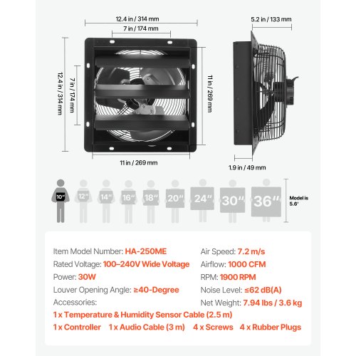 VEVOR 10 in Shutter Exhaust Fan with Smart Programming Controller Wall Mount<br/>Electrostatic Coating<br/>Spiral Fan Blades<br/>Weather-Resistant Build<br/>Robust Housing<br/>Flexible Mounting<br/>Broad Compatibility<br/>Airflow: 1000 CFM,Noise Level: ≤62 dB(A),Air Speed: 7.2 m/s,Temperature Rise: ≤70K,Item Model Number: HA-250ME,Item Dimensions: 12.36 x 7.09 x 12.36 in / 314 x 180 x 314 mm,Louver Opening Angle: ≥40-Degree,Net Weight: 7.94 lbs / 3.6 kg,Power: 30W,RPM: 1900 RPM,Main Material: Q235B Carbon Steel,Rated Voltage: 100–240V Wide Voltage
