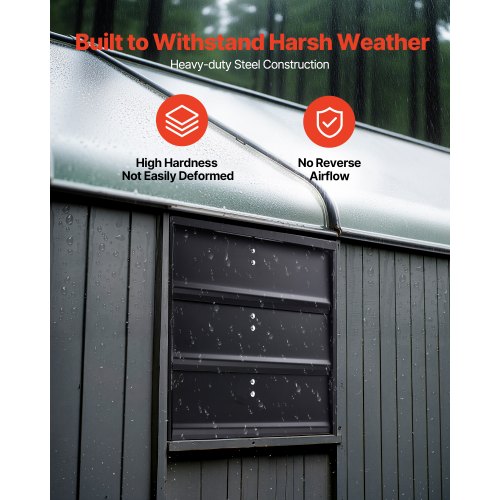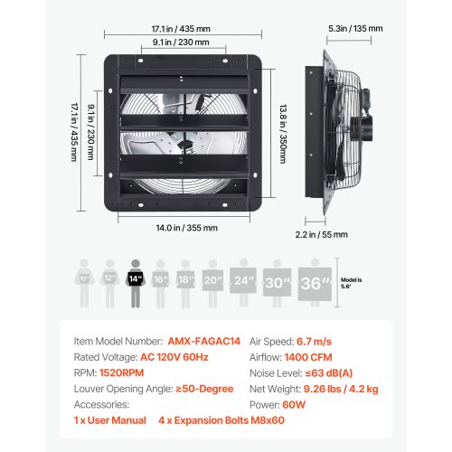 VEVOR 14 in Shutter Exhaust Fan with Speed Controller Wall Mount for Shed<br/>Electrostatic Coating<br/>Spiral Fan Blades<br/>Weather-Resistant Build<br/>Robust Housing<br/>Flexible Mounting<br/>Broad Compatibility<br/>Airflow: 1400 CFM,Noise Level: ≤63 dB(A),Air Speed: 6.7 m/s,Temperature Rise: ≤70K,Item Model Number: AMX-FAGAC14,Item Dimensions: 17.13 x 17.13 x 7.48 in / 435 x 435 x 190 mm,Louver Opening Angle: ≥50-Degree,Net Weight: 9.26 lbs / 4.2 kg,Power: 60W,RPM: 1520 RPM,Main Material: Q235B Carbon Steel,Rated Voltage: AC 120V 60Hz