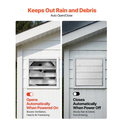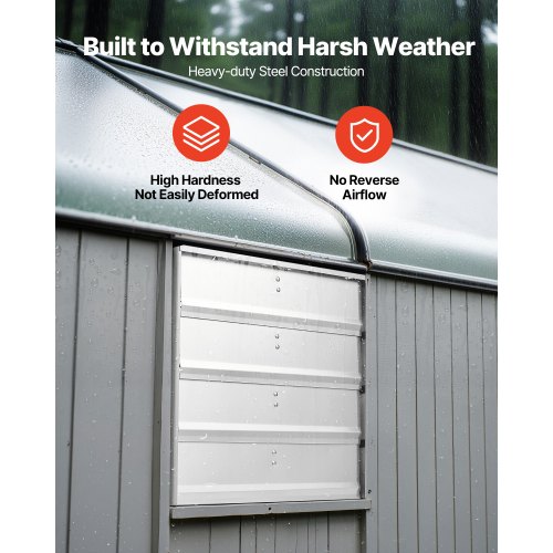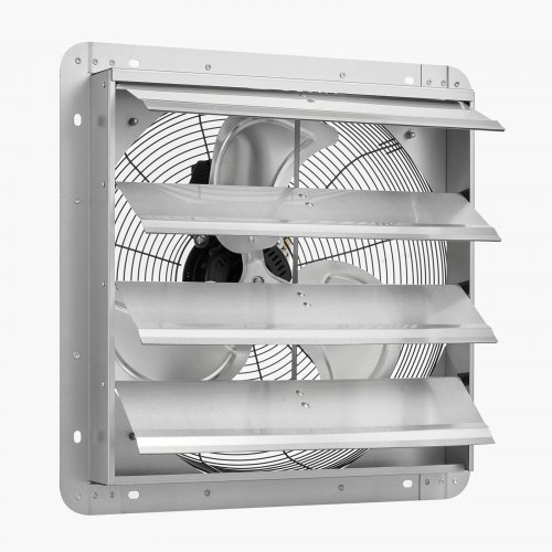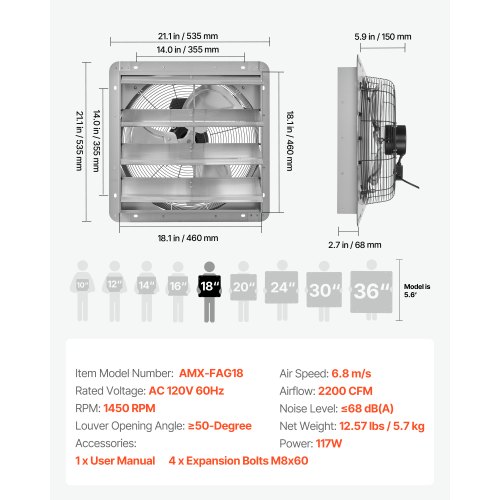 VEVOR 18 in Shutter Exhaust Fan Wall Mount 2200 CFM for Shed<br/>Electrostatic Coating<br/>Spiral Fan Blades<br/>Weather-Resistant Build<br/>Robust Housing<br/>Flexible Mounting<br/>Broad Compatibility<br/>Airflow: 2200 CFM,Noise Level: ≤68 dB(A),Air Speed: 6.8 m/s,Temperature Rise: ≤70K,Item Model Number: AMX-FAG18,Item Dimensions: 21.06 x 21.06 x 8.58 in / 535 x 535 x 218 mm,Louver Opening Angle: ≥50-Degree,Net Weight: 12.57 lbs / 5.7 kg,Power: 117W,RPM: 1450 RPM,Main Material: Q235B Carbon Steel,Rated Voltage: AC 120V 60Hz