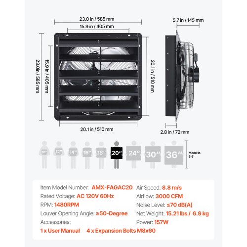 VEVOR 20 in Shutter Exhaust Fan with Speed Controller Wall Mount for Shed<br/>Electrostatic Coating<br/>Spiral Fan Blades<br/>Weather-Resistant Build<br/>Robust Housing<br/>Flexible Mounting<br/>Broad Compatibility<br/>Airflow: 3000 CFM,Noise Level: ≤70 dB(A),Air Speed: 8.8 m/s,Temperature Rise: ≤70K,Item Model Number: AMX-FAGAC20,Item Dimensions: 23.03 x 23.03 x 8.54 in / 585 x 585 x 217 mm,Louver Opening Angle: ≥50-Degree,Net Weight: 15.21 lbs / 6.9 kg,Power: 157W,RPM: 1480 RPM,Main Material: Q235B Carbon Steel,Rated Voltage: AC 120V 60Hz