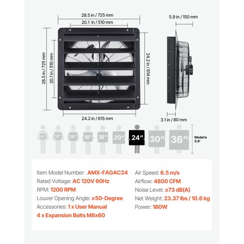VEVOR 24 in Shutter Exhaust Fan with Speed Controller Wall Mount for Shed<br/>Electrostatic Coating<br/>Spiral Fan Blades<br/>Weather-Resistant Build<br/>Robust Housing<br/>Flexible Mounting<br/>Broad Compatibility<br/>Airflow: 4800 CFM,Noise Level: ≤73 dB(A),Air Speed: 6.5 m/s,Temperature Rise: ≤70K,Item Model Number: AMX-FAGAC24,Item Dimensions: 28.58 x 28.58 x 9.06 in / 725 x 725 x 230 mm,Louver Opening Angle: ≥50-Degree,Net Weight: 23.37 lbs / 10.6 kg,Power: 180W,RPM: 1200 RPM,Main Material: Q235B Carbon Steel,Rated Voltage: AC 120V 60Hz