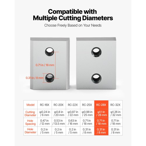 VEVOR 6 Pcs Rebar Cutter Blades for 1-1/8Inch 28mm #9 with Screws Spring Washers<br/>Cr12MoV Steel Material<br/>Easy to Replace<br/>Rich Install set<br/>Wide Application<br/>Precise Cutting<br/>Super-Sharp Cutting Edge<br/>Item Dimensions (L x W x T): 1.42 x 1.1 x 0.6 in / 36 x 28 x 15 mm,Item Model Number: RC-28X,Quantity: 3 Pairs,Hole Diameter: 0.71 in / 18 mm,Net Weight: 1.6 lbs / 0.72 kg,Main Material: Cr12MoV