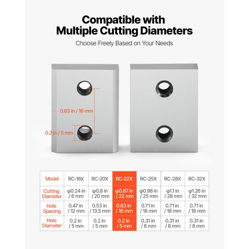 VEVOR 6 Pcs Rebar Cutter Blades for 7/8Inch 22mm #7 with Screws Spring Washers<br/>Cr12MoV Steel Material<br/>Easy to Replace<br/>Rich Install set<br/>Wide Application<br/>Precise Cutting<br/>Super-Sharp Cutting Edge<br/>Item Dimensions (L x W x T): 1.1 x 0.8 x 0.4 in / 28 x 20 x 10 mm,Item Model Number: RC-22X,Quantity: 3 Pairs,Hole Diameter: 0.63 in / 16 mm,Net Weight: 0.4 lbs / 0.18 kg,Main Material: Cr12MoV