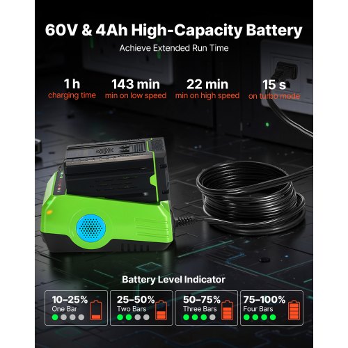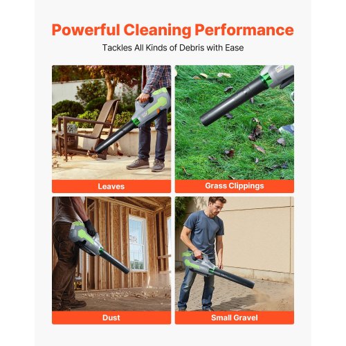 VEVOR 60V Leaf Blower Cordless 650 CFM/125 MPH 3 Speed Control with 5Ah Battery<br/>Cordless Leaf Blower<br/>Powerful Motor<br/>Three-Speed Control<br/>Ergonomic Build<br/>Versatile Cleaning<br/>Thoughtful Present<br/>Battery Capacity: 4 Ah,Main Materials: Copper; PP plastic,Battery Voltage: DC 60V,Output Current: 4.4A; Fully charges in approx. 1 hour,Item Model Number: B8120,Speed Settings: Variable speed + Turbo mode,Product Dimensions: 35.83 x 5.91 x 10.43 in / 910 x 150 x 265 mm,Input Voltage/Frequency: 120–240V AC, 50/60Hz,Output Voltage: 62.7V,Net Weight: 11.9 lbs / 5.4 kg