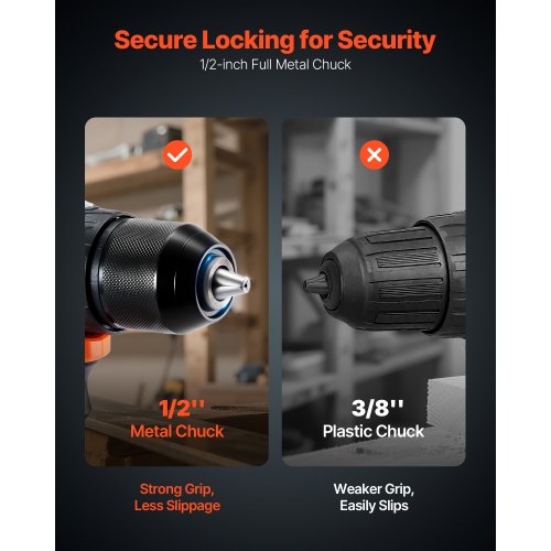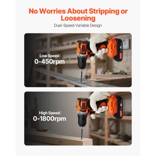 VEVOR Cordless Drill Driver 1/2 inch Metal Chuck Brushless Motor Dual-Speed<br/>Strong Power, Multiple Uses<br/>Adjustable Settings<br/>Easy Storage<br/>Long-Lasting Battery Life<br/>Reliable Design for Smooth Operation<br/>Complete Home Toolkit<br/>Speed: Dual-Speed, 0-450rpm / 0-1800rpm,Torque: 55N·m,Speed 2 Power: 60W / 2.94A,Steel Drilling Capacity: 0.24 inch / 6 mm,Product Dimensions: 5.91 x 3.15 x 9.06 inch / 150 x 80 x 230 mm,Speed 1 Power: 70W / 3.55A,Charging Time: 1.3 Hours,Power Supply: AC 120V 60Hz,Torque Settings: 21+1nm,Wood Drilling Capacity: 1.18 inch / 30 mm,Chuck Size: 1/2-inch Single Set Full Metal Chuck,Battery Pack Quantity: 1,Operating Voltage: 15.5-21.5V,Battery: 2000mAh, 5 Cells,Item Model Number: DJZH5025-13,Load Power: 500W,Net Weight: 6.6 lbs / 3.0 kg,Main Material: PA6+GF30+TPE+Rubber