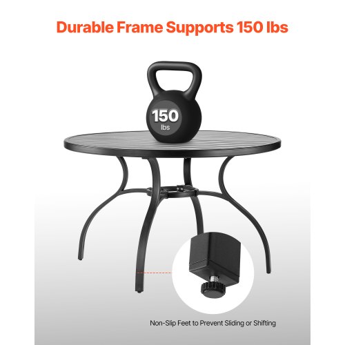 VEVOR Outdoor Patio Dining Table Round Metal Steel Slat Garden Furniture for 4<br/>Rust-Resistant Powder-Coated Finish<br/>Tabletop Supports up to 150 lbs<br/>Non-Slip Leg Pads<br/>Create Your Personal Retreat<br/>Great for Outdoor Parties<br/>Versatile Use<br/>Main Materials: Carbon Steel,Product Dimension: 47x29 in / 1200x725 mm,Color: Black,Item Model Number: WZ601,Surface Treatment: Powder Coated, Galvanized,Product Net Weight: 38.91 lbs / 17.65 kg,Max Load Capacity: 150 lbs / 68.04 kg