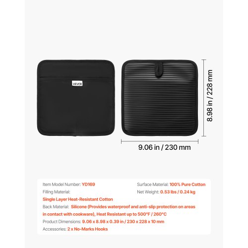 VEVOR Pot Holders Heat Resistant 500°F with Anti-Slip Silicone Strips 2 Pack<br/>Kitchen Pot Holders (2-Pack)<br/>Strong Non-Slip Grip<br/>Thin & Space-Saving<br/>Durable & Easy to Clean<br/>Great Present Choice<br/>Pocket Design<br/>Back Material: Silicone (Provides waterproof and anti-slip protection on areas in contact with cookware), Heat Resistant up to 500°F / 260°C,Item Model Number: YD169,Surface Material: 100% Pure Cotton,Filling Material: Single Layer Heat-Resistant Cotton,Product Dimensions: 9.06 x 8.98 x 0.39 inch / 230 x 228 x 10 mm,Net Weight: 0.53 lbs / 0.24 kg