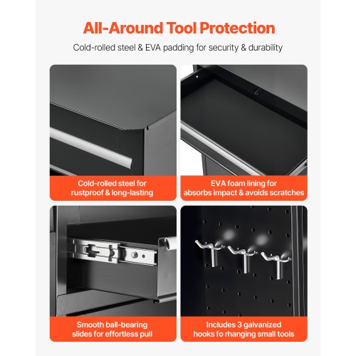 VEVOR Rolling Tool Chest 5 Drawers Tool Storage Cabinet with Lockable Wheels<br/>Multifunctional Rolling Tool Chest<br/>Organized Storage<br/>High-Level Protection<br/>Convenient & Secure Movement<br/>Multi-Scenario Compatibility<br/>Enhanced Packaging Protection<br/>Item Material: SPCC with Powder-Coated Finish,Shelf Dimensions: 20.6 x 9.3 x 0.5 in/525 x 238 x 14 mm,Small Drawer Dimensions: 15 x 8 x 1.5 in/382 x 204 x 40 mm,Color: Black,Without Rack: 20.9 x 11 x 40.9 in/530 x 280 x 1040 mm,Item Model Number: TBC112015,Item Dimensions:,Large Drawer Dimensions: 18 x 10 x 2.5 in/459 x 255 x 64 mm,With Rack and Casters: 23.6 x 11 x 28.4 in/601 x 280 x 723 mm,Net Weight: 41.67 lbs/18.9 kg,Screwdriver Rack Dimensions: 10.7 x 2.7 x 2.3 in/273 x 70 x 60 mm