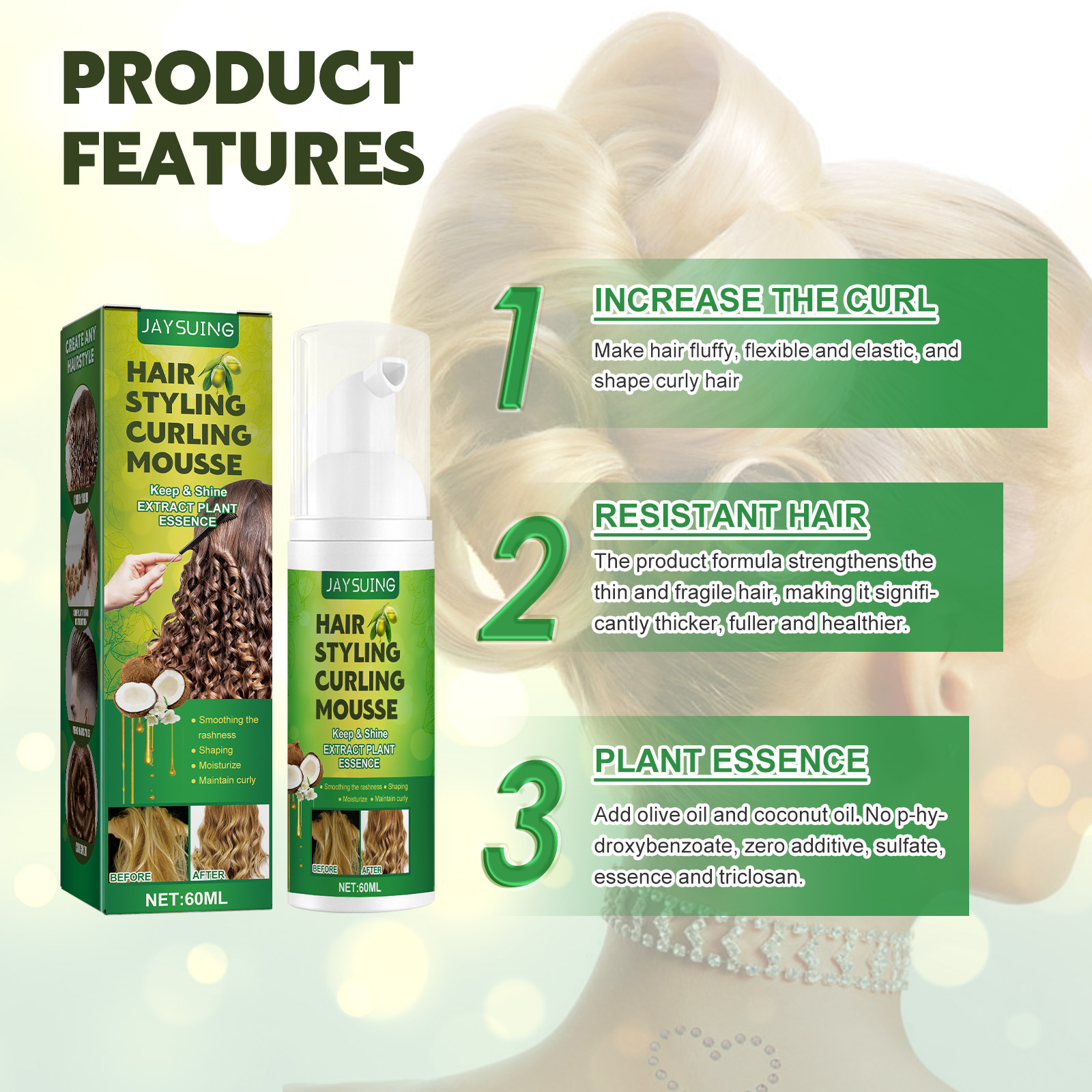 Our fluffy hair styling mousse contains olive oil, coconut oil, panthenol. It can increase the degree of curl to make the hair fluffy, flexible, elastic, shape curly durable hair, make the hair appear thicker, fuller, healthier, moisturize and shape, improve the hair luster and curl, the effect is significant. The way to use it is simple: spray the mousse evenly on the palm of your hand; Apply the kneaded mousse evenly on the wet hair, and curl the fingers to adjust the details to make the hair curl; After use, curl your hair, let it sit for about 15 minutes, and then dry your hair with a hair dryer, i.e. finish curling/styling. Fluffy Curly Hair Styling mousse combines the elasticity of olive oil and coconut oil to help hair thrive, enhance shine and create a durable curly look.