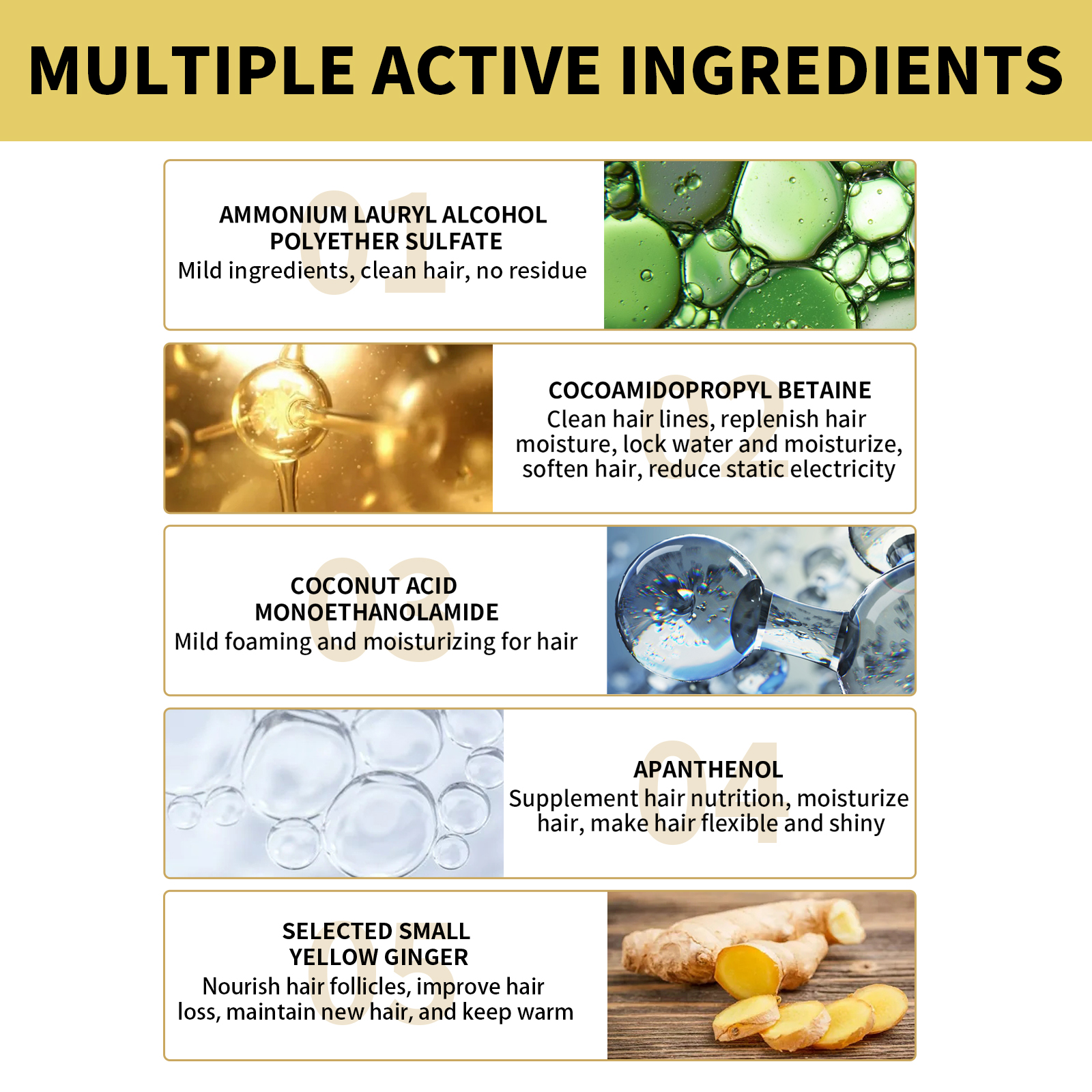 Our ginger hair shampoo contains cocoate monoethanolamide, ammonium lauryl sulfate, cocoamide propyl betaine. It can accelerate hair growth, repair damaged hair, reduce hair loss, and make your hair thicker and shinier. Its use is simple: First of all, wet your hair thoroughly with warm water, take out anti-hair loss shampoo, apply on the scalp, rub out rich foam, massage the hair roots and scalp for 2-3 minutes, rinse off the foam with water, after use, it will help nourish the scalp, protect the hair follicles, prevent hair loss, balance the scalp sebum, strengthen the hair roots, promote blood circulation, accelerate hair regeneration, and make your hair black and bright.
