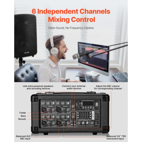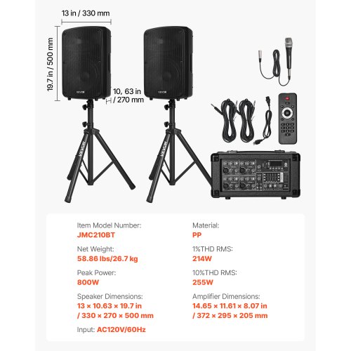2 X 10 in Speakers PA System 800W Mixer Wireless Bluetooth Mic for DJ PartyProfessional PA SystemStereo Sound for Every CornerCompatible with Multiple InputShockproof & Wear-ResistantAll Essential Accessories IncludedVersatile UseInput: AC 120V/60Hz,Peak Power: 800W,1% THD RMS: 214W,Amplifier Dimensions: 14.65 x 11.61 x 8.07 in/ 372 x 295 x 205 mm,10% THD RMS: 255W,Speaker Dimensions: 13 x 10.63 x 19.7 in/ 330 x 270 x 500 mm,Item Model Number: JMC210BT,Material: PP,Net Weight: 58.86 lbs/26.7 kg