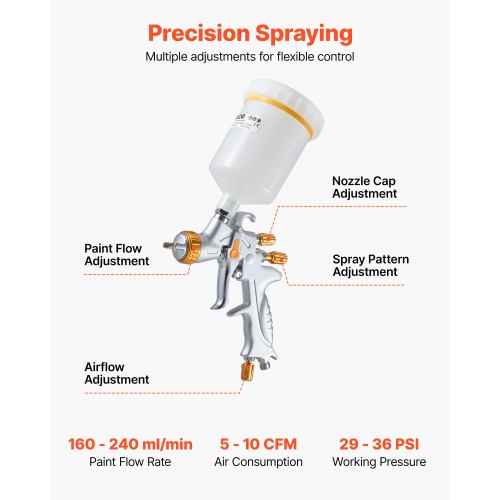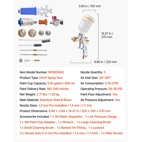 VEVOR HVLP Air Spray Gun Gravity Feed Paint Sprayer Gun 3 Nozzles 1.3/1.4/1.7mm<br/>Multiple Adjustments for Precise Spraying<br/>Large-Capacity Paint Cup<br/>Precision Build for Smoother Spraying<br/>Wide Applications<br/>Durable to Use<br/>High Performance<br/>Operating Pressure: 29-36 PSI,Paint Delivery Rate: 160-240 ml/min,Paint Flow Adjustment: Yes,Air Inlet Size: 1/4" NPT,Paint Cup Capacity: 0.16 gallon / 600 ml,Product Dimensions: 8.66 x 3.94 x 14.57 in / 220 x 100 x 370 mm,Air Consumption: 5-10 CFM,Product Type: HVLP Spray Gun,Nozzle Quantity: 3,Nozzle Sizes: 1.3 mm Pre-installed / 1.4 mm / 1.7 mm,Air Pressure Adjustment: Yes,Item Model Number: RF6000AG,Net Weight: 2.71 lbs / 1.23 kg,Main Material: Stainless Steel & Brass