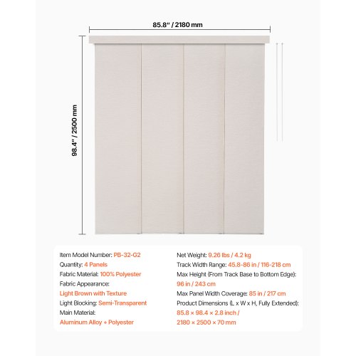 Panel Track Blinds Extendable Track from 45.8in to 86in W Trimmable Light BrownHidden Track DesignSliding SystemWeighted Bottom GuideFlexible OperationVersatile ApplicationsTrim-to-Fit HeightFabric Appearance: Light Brown with Texture,Light Blocking: Semi-Transparent,Product Dimensions (L x W x H, Fully Extended): 85.8 x 98.4 x 2.8 inch / 2180 x 2500 x 70 mm,Item Model Number: PB-32-G2,Max Height (From Track Base to Bottom Edge): 96 in / 243 cm,Quantity: 4 Panels,Track Width Range: 45.8-86 in / 116-218 cm,Net Weight: 9.26 lbs / 4.2 kg,Max Panel Width Coverage: 85 in / 217 cm,Fabric Material: 100% Polyester,Main Material: Aluminum Alloy + Polyester