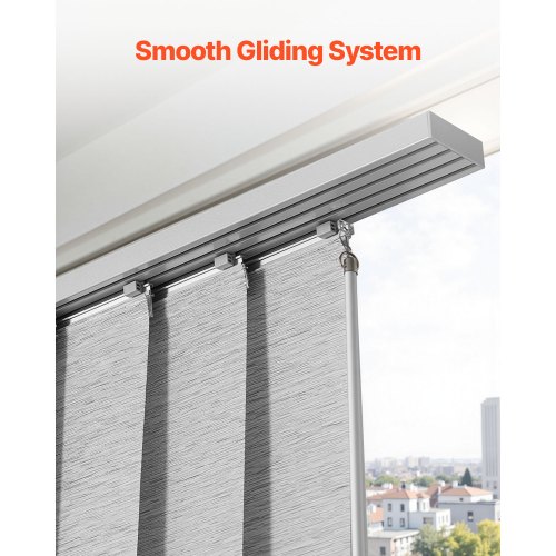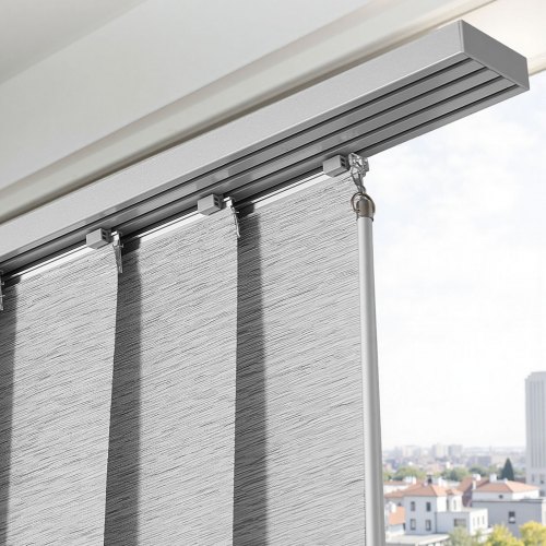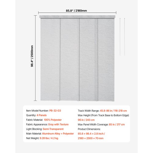 Panel Track Blinds Extendable Track from 45.8 in to 86 in Width Trimmable GrayHidden Track DesignSliding SystemWeighted Bottom GuideFlexible OperationVersatile ApplicationsTrim-to-Fit HeightFabric Appearance: Gray with Texture,Light Blocking: Semi-Transparent,Product Dimensions (L x W x H, Fully Extended): 85.8 x 98.4 x 2.8 inch / 2180 x 2500 x 70 mm,Item Model Number: PB-32-G3,Max Height (From Track Base to Bottom Edge): 96 in / 243 cm,Quantity: 4 Panels,Track Width Range: 45.8-86 in / 116-218 cm,Net Weight: 9.26 lbs / 4.2 kg,Max Panel Width Coverage: 85 in / 217 cm,Fabric Material: 100% Polyester,Main Material: Aluminum Alloy + Polyester