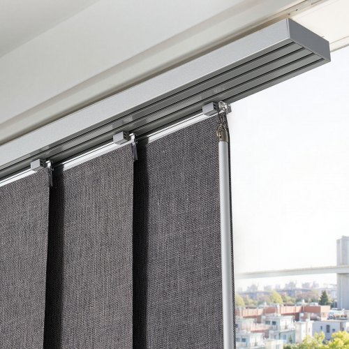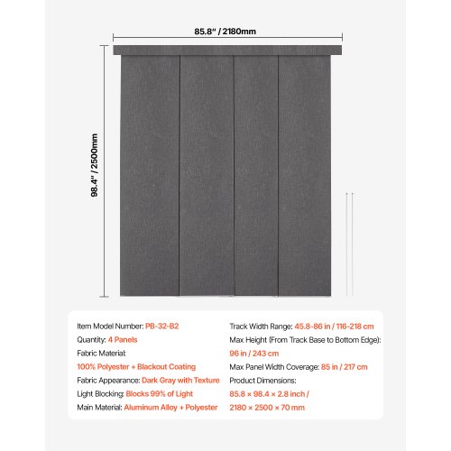 Panel Track Blinds Extendable Track from 45.8 in to 86 in W Trimmable Dark GrayHidden Track DesignSliding SystemWeighted Bottom GuideFlexible OperationVersatile ApplicationsTrim-to-Fit HeightFabric Appearance: Dark Gray with Texture,Light Blocking: Full Blackout,Product Dimensions (L x W x H, Fully Extended): 85.8 x 98.4 x 2.8 inch / 2180 x 2500 x 70 mm,Item Model Number: PB-32-B2,Max Height (From Track Base to Bottom Edge): 96 in / 243 cm,Quantity: 4 Panels,Track Width Range: 45.8-86 in / 116-218 cm,Net Weight: 10.14 lbs / 4.6 kg,Max Panel Width Coverage: 85 in / 217 cm,Fabric Material: 100% Polyester + Blackout Coating,Main Material: Aluminum Alloy + Polyester
