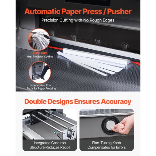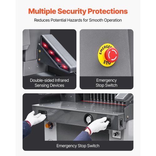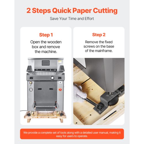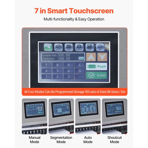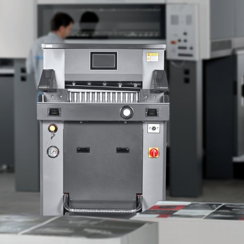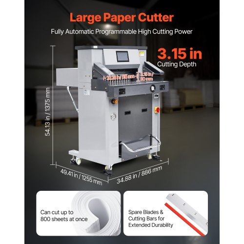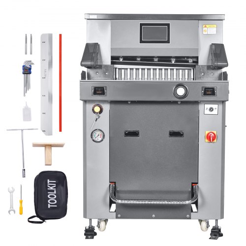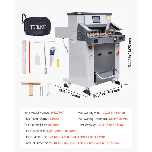 VEVOR Electric Hydraulic Paper Cutter, 2500W Heavy Duty Paper Cutter Machine 20.28" /515mm Cutting Width, 3.14"/80mm Cutting Thickness, Electric Paper Trimmer with 7" Touchscreen Numerical ControlFully Automatic Hydraulic Paper CutterMultifunctional TouchscreenHigh-Precision CuttingMultiple Security ProtectionsUsage NotesIndependent Paper Press FunctionMax Cutting Width: 19.49 in / 495mm,Cutting Precision: ±0.3mm,Max Power Output: 2100W,Item Model Number: H520TV7,Product Weight: 703.27 lbs / 319 kg,Max Cutting Thickness: 3.15 in / 80mm,Product Dimensions: 49.41 x 34.88 x 54.13 in / 1255 x 886 x 1375mm,Blade: Material: High-Speed Tool Steel, Dimensions: 25.59 x 3.15 x 0.39 in / 650 x 80 x 10mm