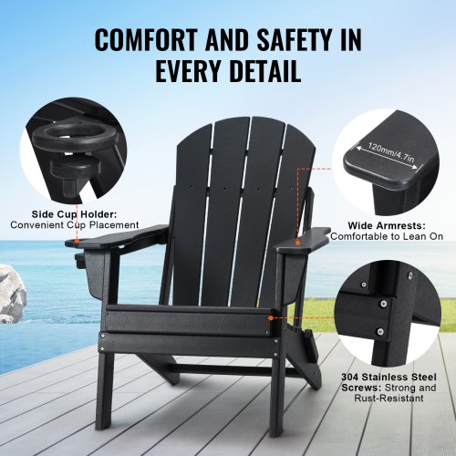 VEVOR Adirondack Chair Plastic Set of 2 All-Weather Folding Fire Pit BlackPlastic Adirondack ChairFoldable DesignEasy AssemblyHigh-Quality HDPE PlasticErgonomic DesignMultiple Color OptionsWeight Capacity: 400 lbs / 181.4 kg,Color: Black,Item Model Number: SS401-BK-2P,Cup Holder Dimensions: Outer Diameter Φ120 mm / Φ4.7 in, Inner Diameter Φ80 mm / Φ3.1 in, Depth 45 mm / 1.8 in,Style: Foldable, 2 Sets,Material: HDPE,Folded Dimensions: 1100 × 755 × 255 mm / 43.3 × 29.7 × 10.0 in,Open Dimensions: 800 × 755 × 915 mm / 31.5 × 29.7 × 36.0 in,Net Weight: 28.55 kg / 62.94 lbs