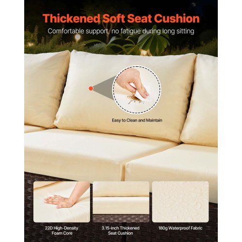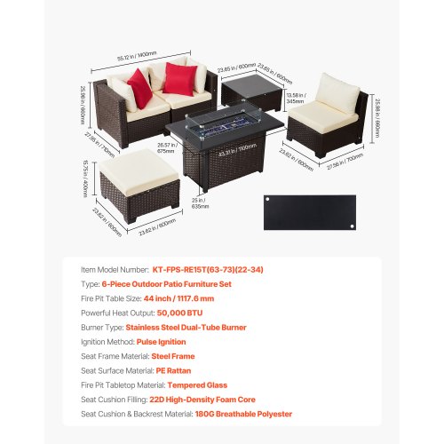 VEVOR 6-Piece Outdoor Patio Furniture Set Outdoor Sectional Conversation Sets<br/>50000 BTU Propane Fire Pit Table<br/>High-Quality Frame & Seat Cushion<br/>Wide Armrests<br/>Enhance Comfort and Aesthetic Appeal<br/>Flexible Combinations<br/>2-in-1 Multifunctional Fire Pit Table<br/>Seat Cushion Filling: 22D High-Density Foam Core,Type: 6-Piece Outdoor Patio Furniture Set,Ignition Method: Pulse Ignition,Seat Surface Material: PE Rattan ,Burner Type: Stainless Steel Dual-Tube Burner,Seat Frame Material: Steel Frame,Item Model Number: KT-FPS-RE15T(63-73)(22-34),Powerful Heat Output: 50,000 BTU,Fire Pit Tabletop Material: Tempered Glass,Fire Pit Table Size: 44 inch / 1117.6 mm,Seat Cushion & Backrest Material: 180G Breathable Polyester