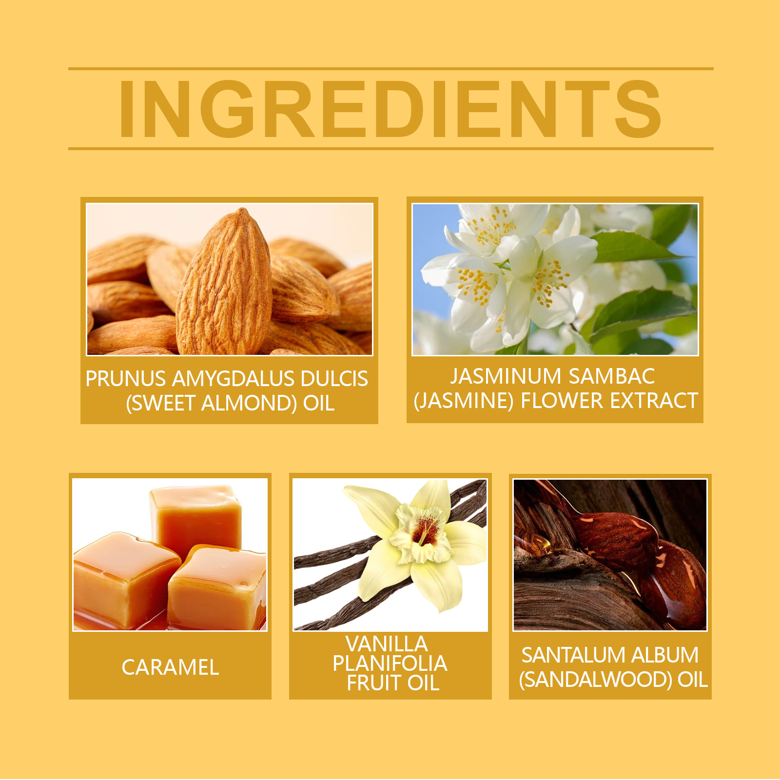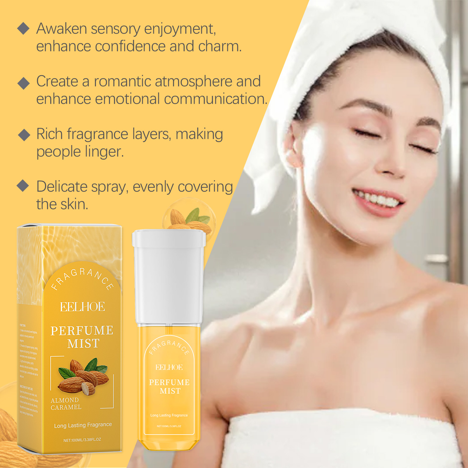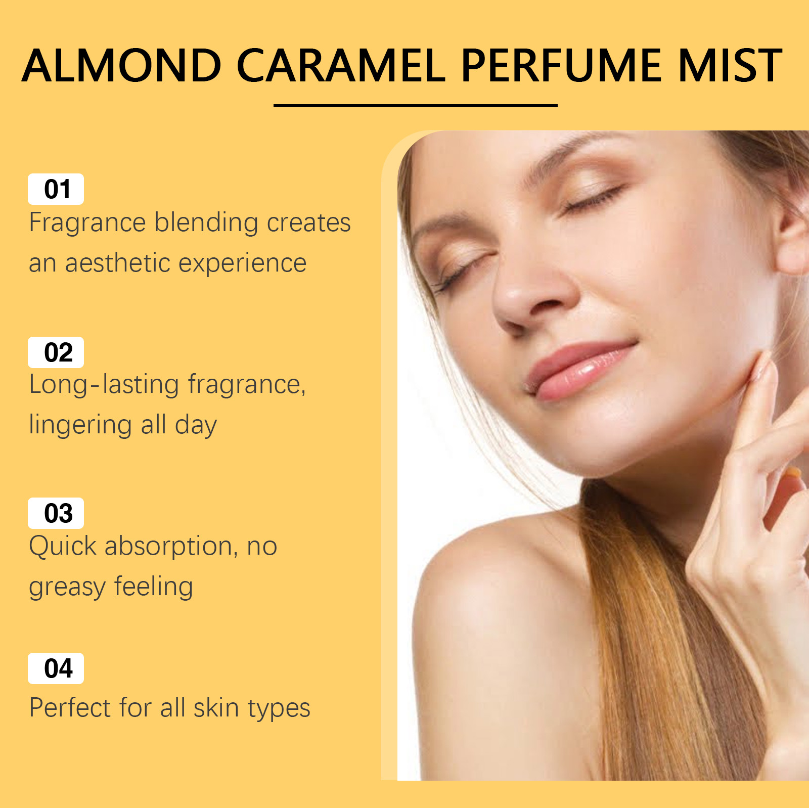 Our body perfume spray (Almond Caramel) contains caramel, jasmine extract. It can create a unique wood fragrance, highlighting the noble elegance. Its use is simple: spray the perfume on the wrist, neck, behind the ears, or spray the perfume in the air and then into the mist, so that the perfume evenly spread throughout the body, leaving a fragrant aroma. And can be absorbed quickly, no greasy feeling.