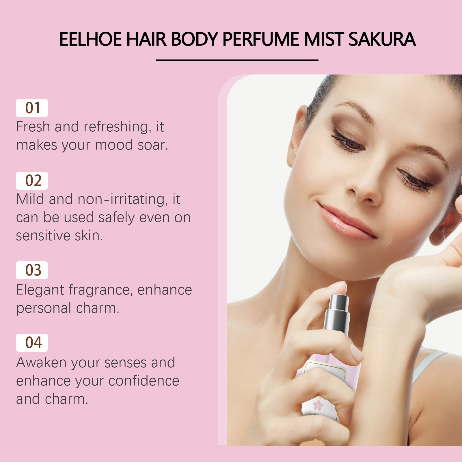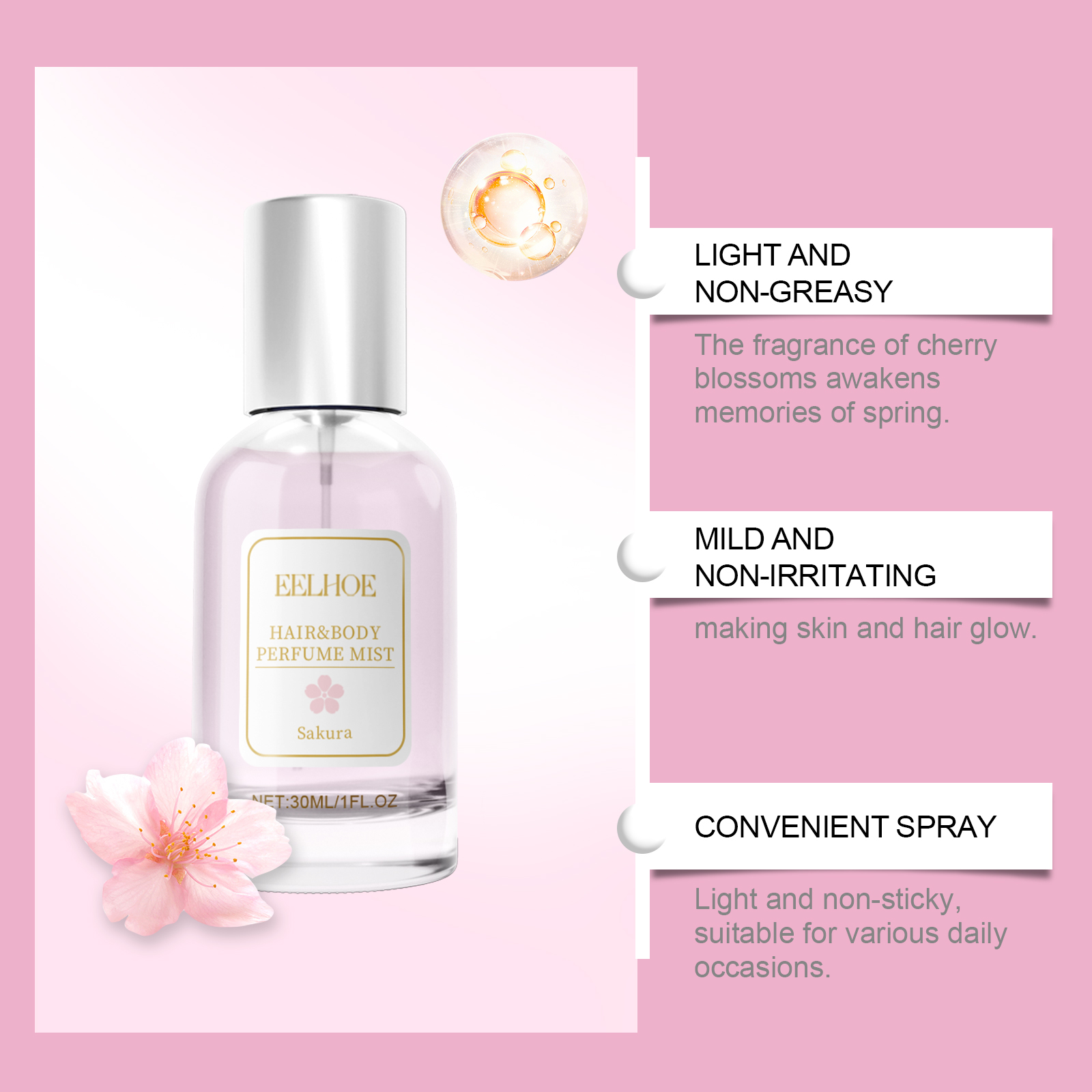 Our Cherry Blossom Body Hair Perfume spray contains PEG-40 hydrogenated castor oil, glycerin. It can be refreshing, let your mood high; Awaken your senses, enhance your confidence and charm; Elegant fragrance, enhance personal charm. Its application is simple: open the bottle cap, press down on the pump head, and apply the right amount of spray to the body and hair. The fragrance of cherry blossoms awakens people's memories of spring. Instant boost of charisma and confidence.