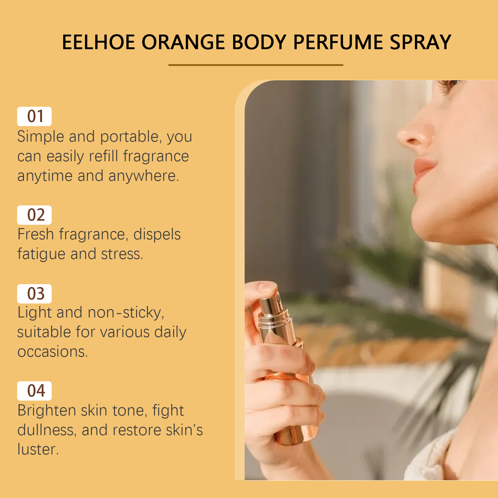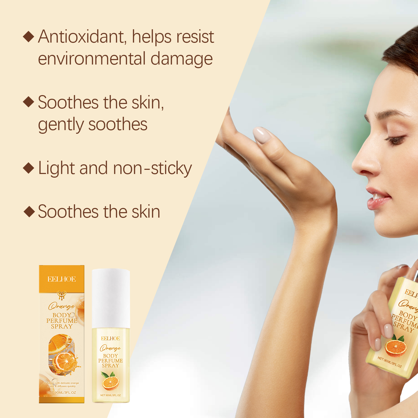 Our fragrant Orange Body spray contains aloe vera leaf extract and gardenia extract. It can be replenished at any time and anywhere, always emitting a sweet smell. Its use is simple: cleanse and dry the body's skin. Remove the lid, press the pump head, and spray the appropriate amount of spray onto the body. It can effectively lock in skin moisture and improve skin moisture. After spraying, the skin is soft and not dry.