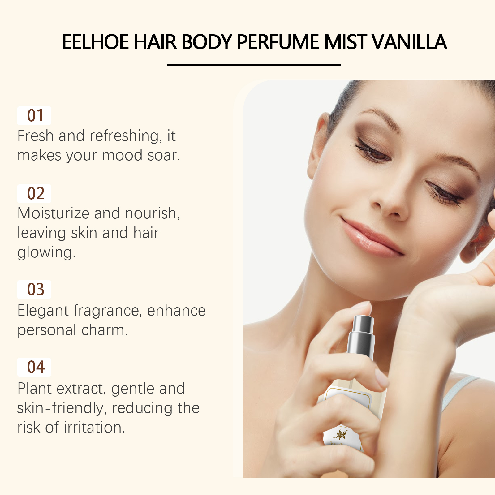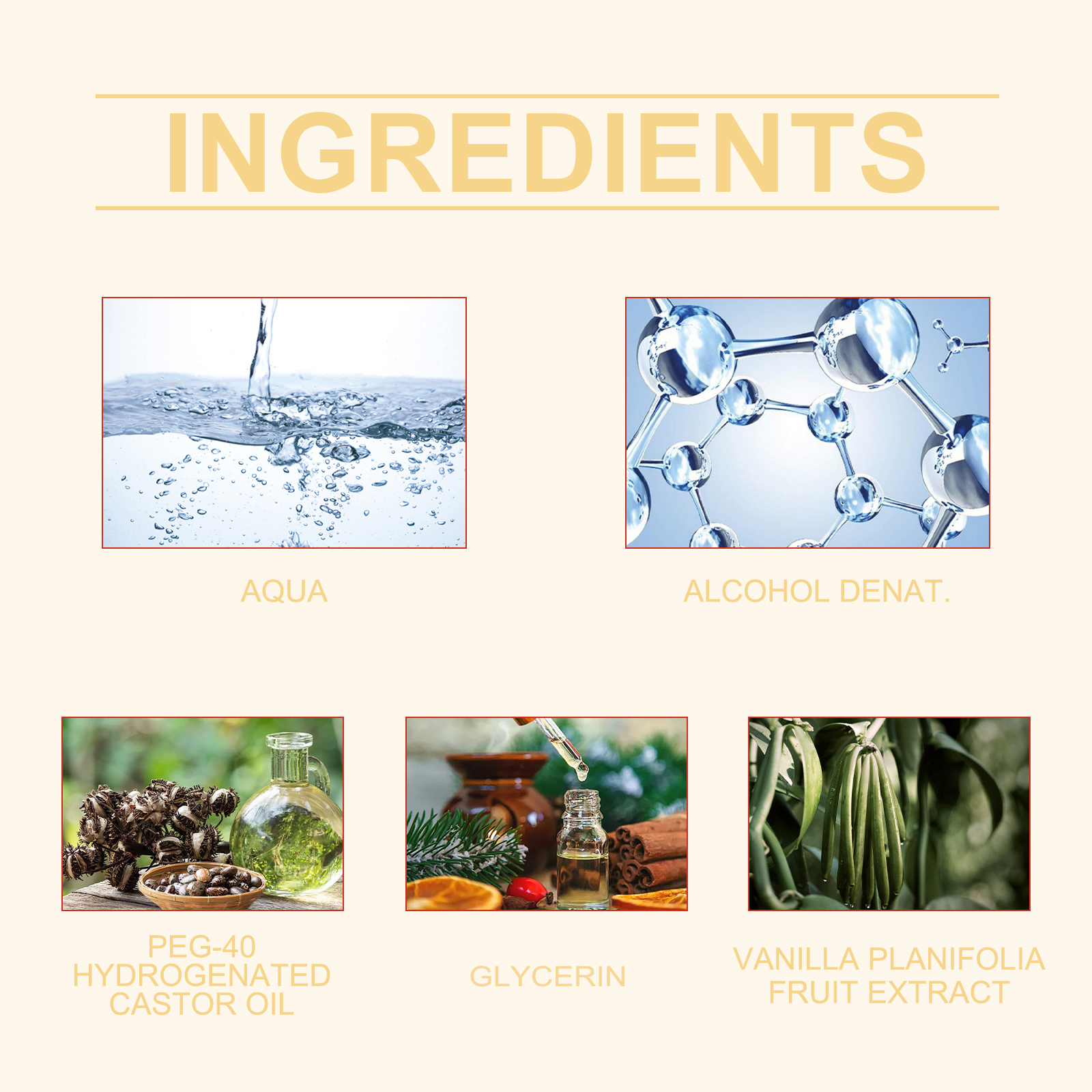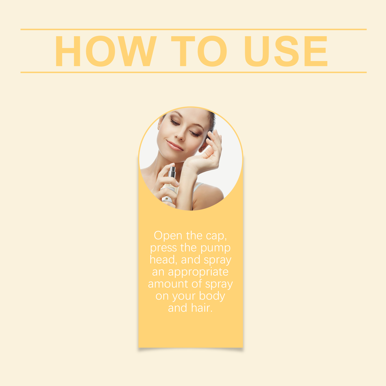 Our Vanilla Body Hair perfume spray contains PEG-40 hydrogenated castor oil, glycerin. It can exude a charming vanilla scent, moisturize skin and hair, and add warmth. Every breath is a new surprise. Light and non-sticky, suitable for all kinds of daily occasions. Its application is simple: open the bottle cap, press down on the pump head, and apply the right amount of spray to the body and hair. The fresh herbs weave the dreamy breath and awaken the vitality of the senses. The scent is long-lasting and gives off charming aromas throughout the day.