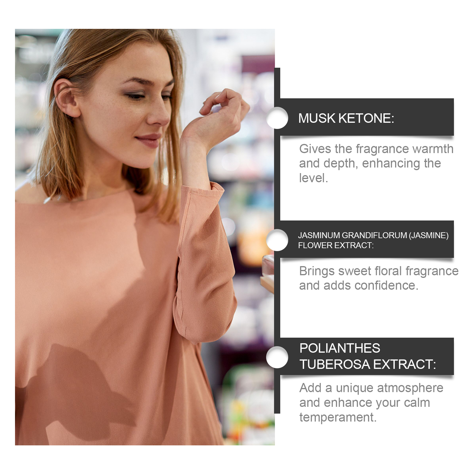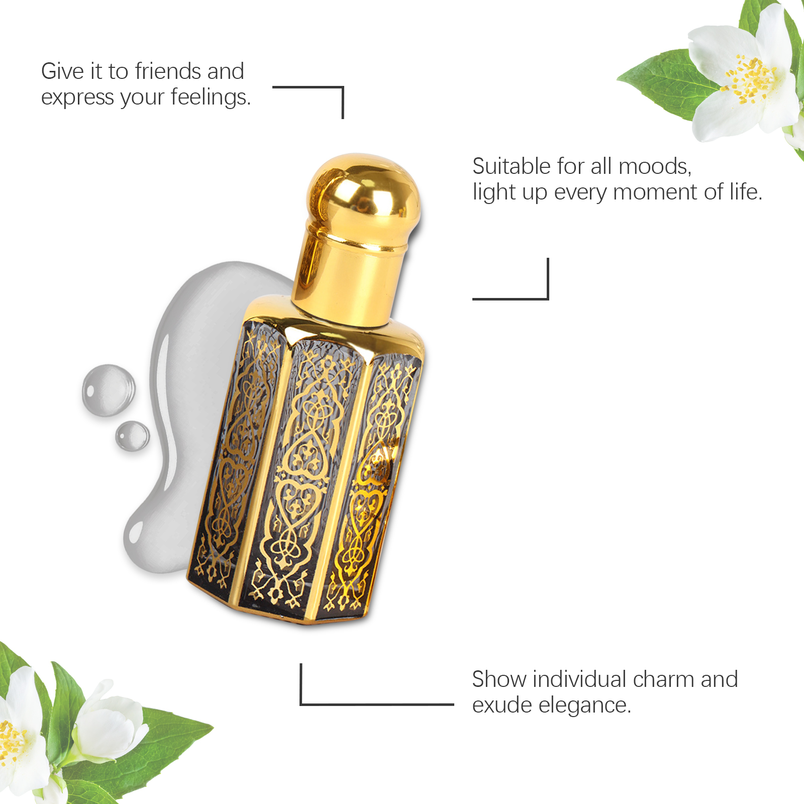 Our Arabian fragrance (Evening Fragrance) contains jasmine extract, neroli oil and tuberose extract. It gives warmth and depth to the scent and elevates the level. Bring sweet flowers, add confidence; Add a unique atmosphere and enhance your calm temperament. Its use method is very simple: 1. Roll the product back and forth on the wrist, behind the ear, temple, etc. 2. Wait 2 minutes for the aroma to fully dissipate. The charming blend of jasmine and late autumn fragrance exudes a calm and elegant quality. All kinds of flowers blend together harmoniously, emitting a unique fragrance.