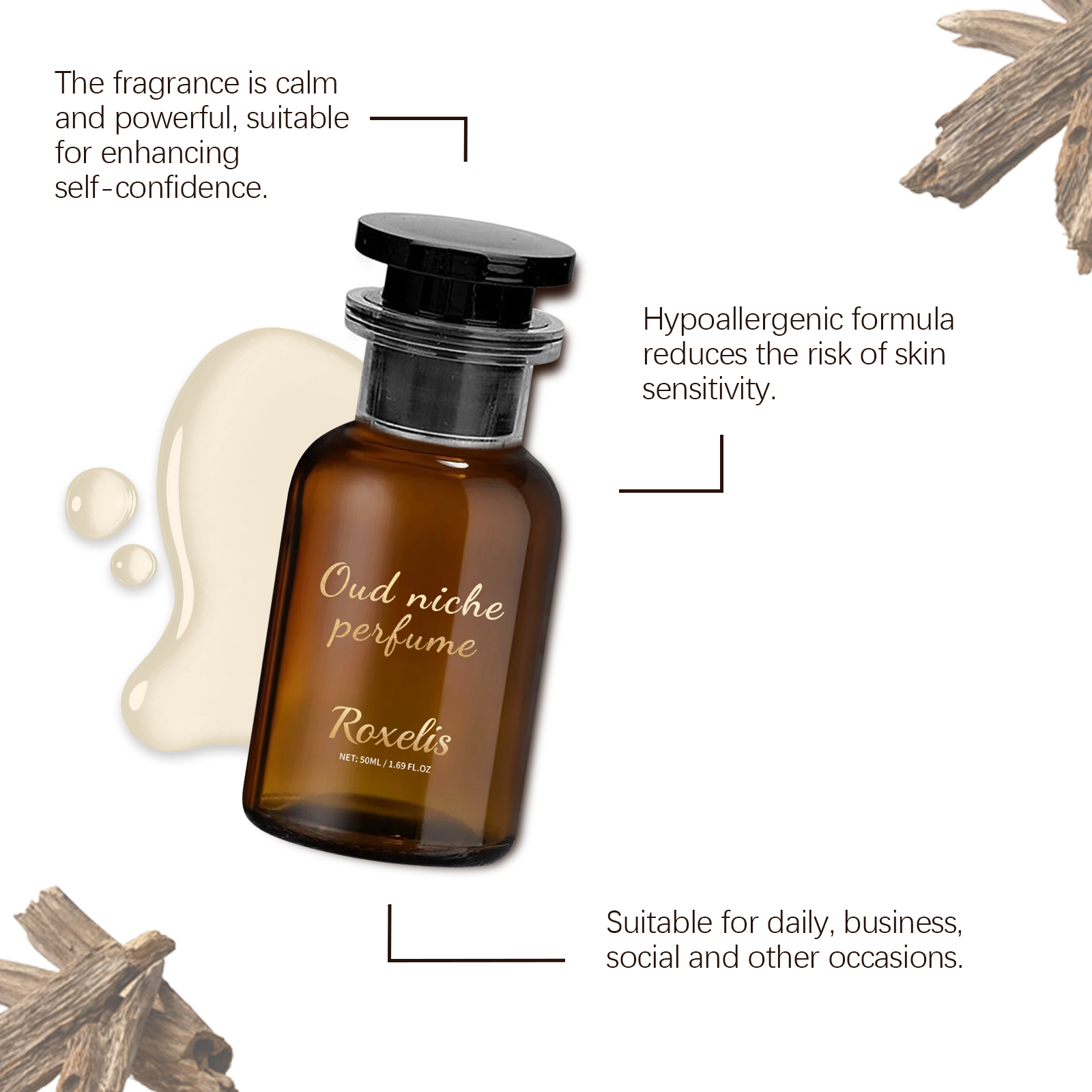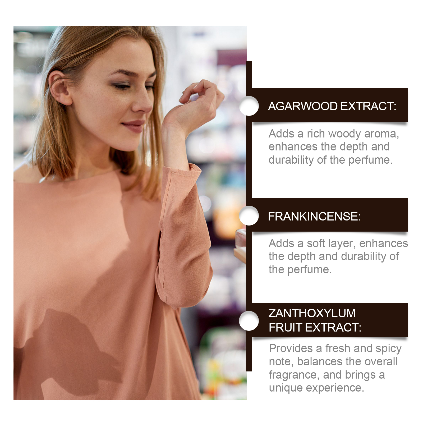 Our black wood niche perfume contains frankincense, agarwood extract, amber extract. It can add a rich wood aroma, enhance the depth and longevity of the perfume. Add soft layers to enhance the depth and durability of the perfume. Its application is simple: 1. Lightly spray the perfume on the wrists, neck, chest and other pulse points; 2. Spray 1-2 times each time to achieve the best results of perfume distribution. The top tone, middle tone and bottom tone are distinct, and the fragrance is varied. Agarwood extract brings a warm wood fragrance, infusing the overall fragrance with stability and comfort.
