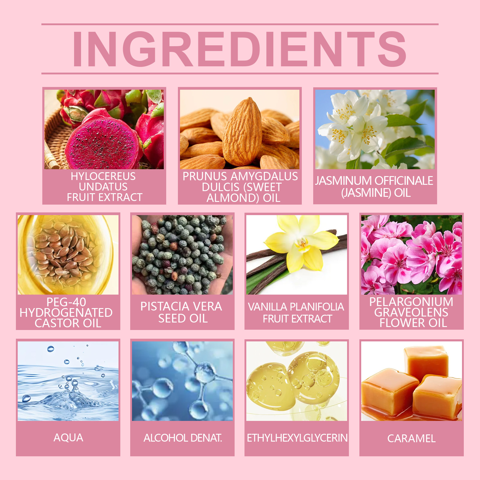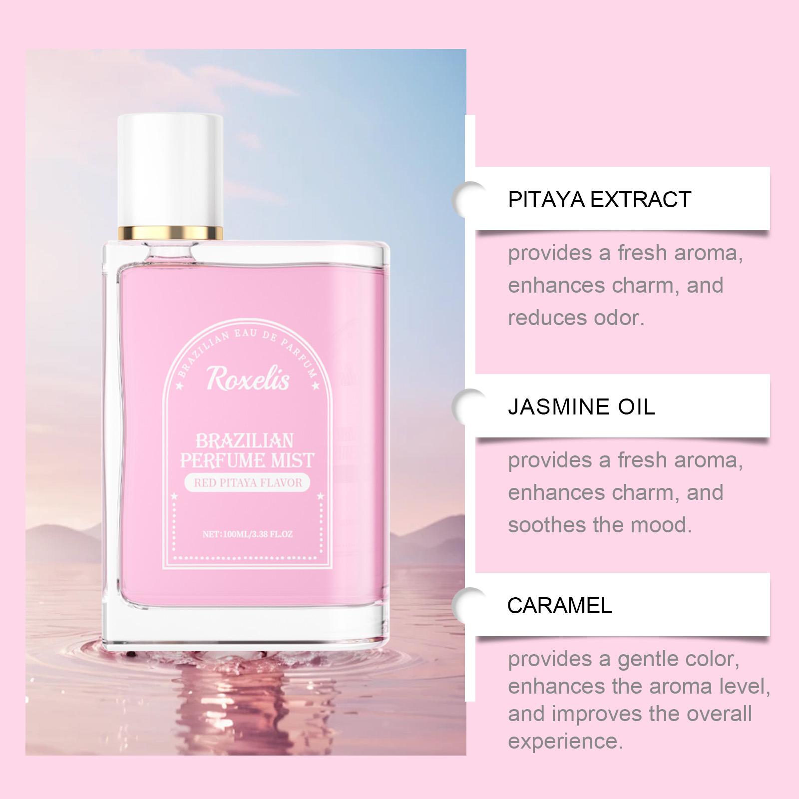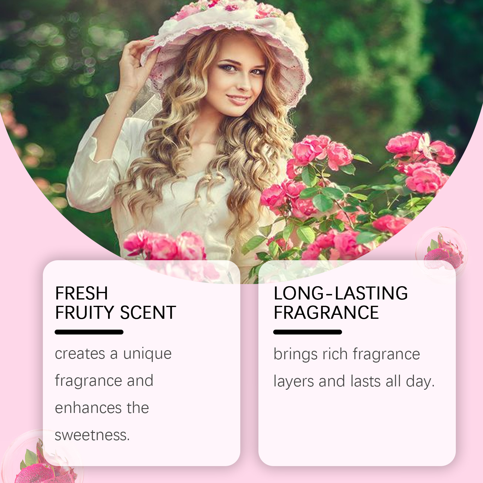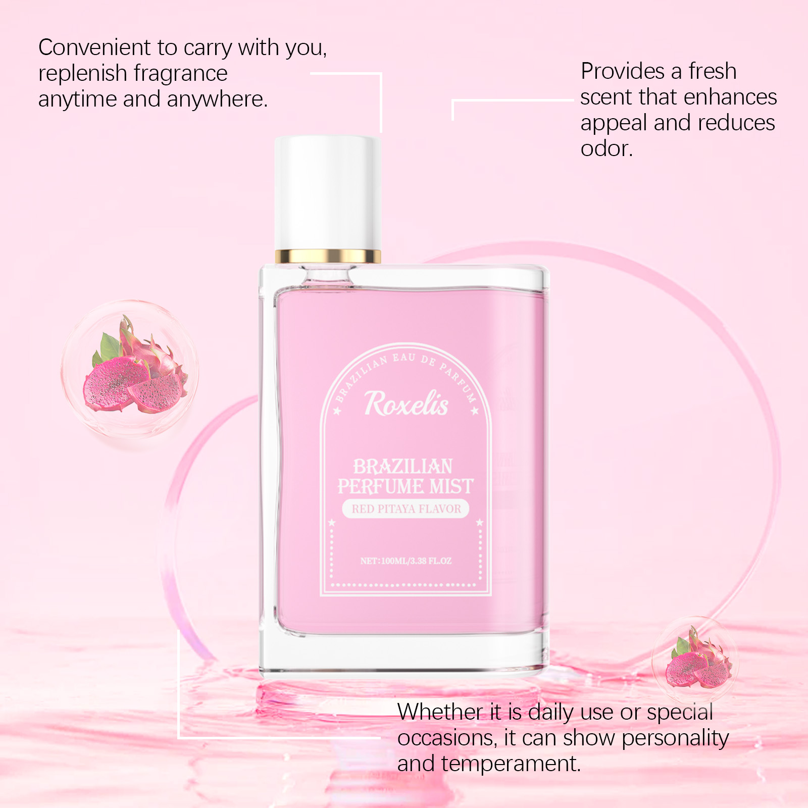 Our Red Dragon Fruit Brazil Eau de Toilette contains denatured ethanol, PEG-40 hydrogenated castor oil. It can create a unique fragrance and enhance sweetness. Delivers rich scent layers that last all day. Its use is simple: spray the perfume on the wrists, neck, behind the ears, etc., or spray the perfume in the air and then step into the mist, allowing the perfume to spread evenly throughout the body, leaving a fragrant aroma. And can provide fresh scent, show personal charm.