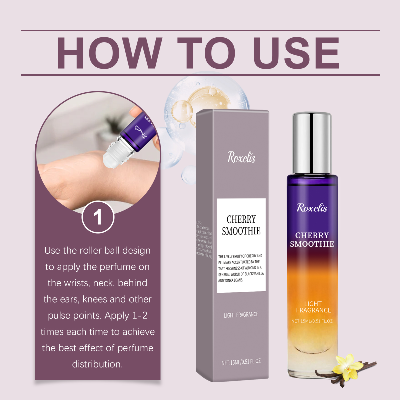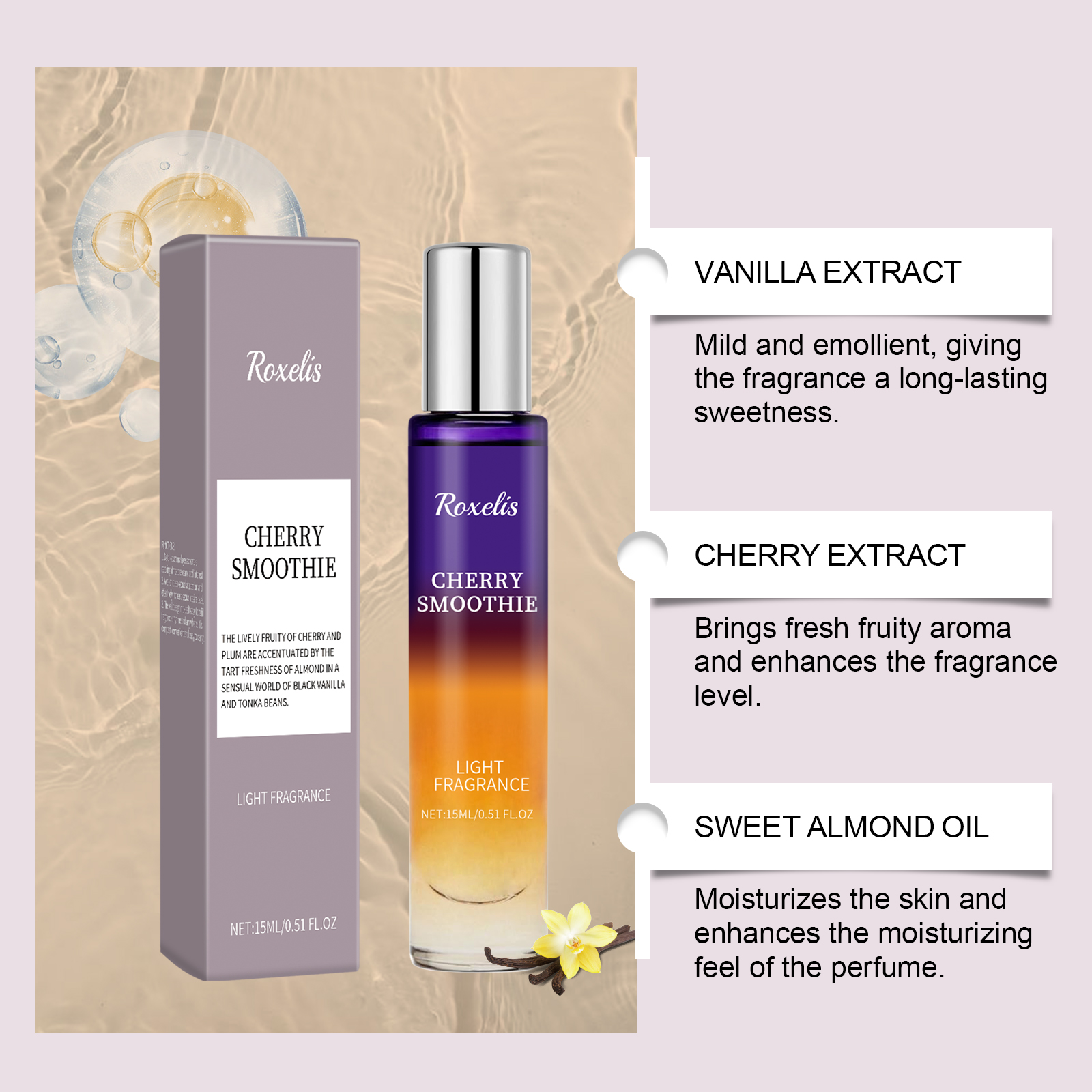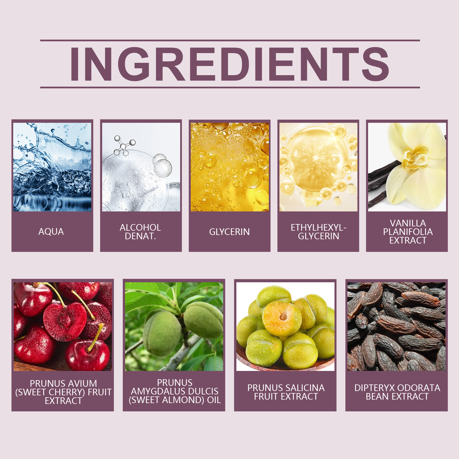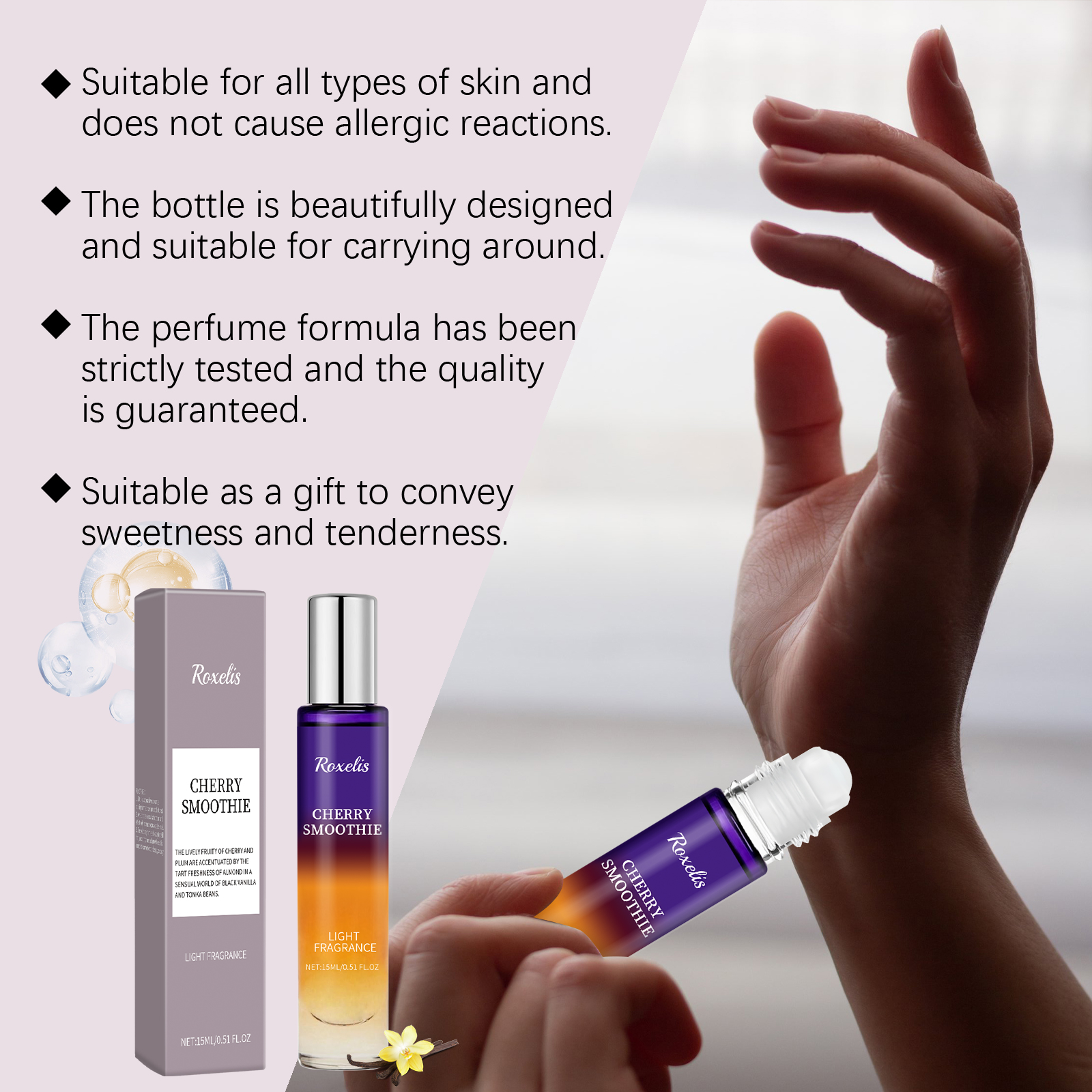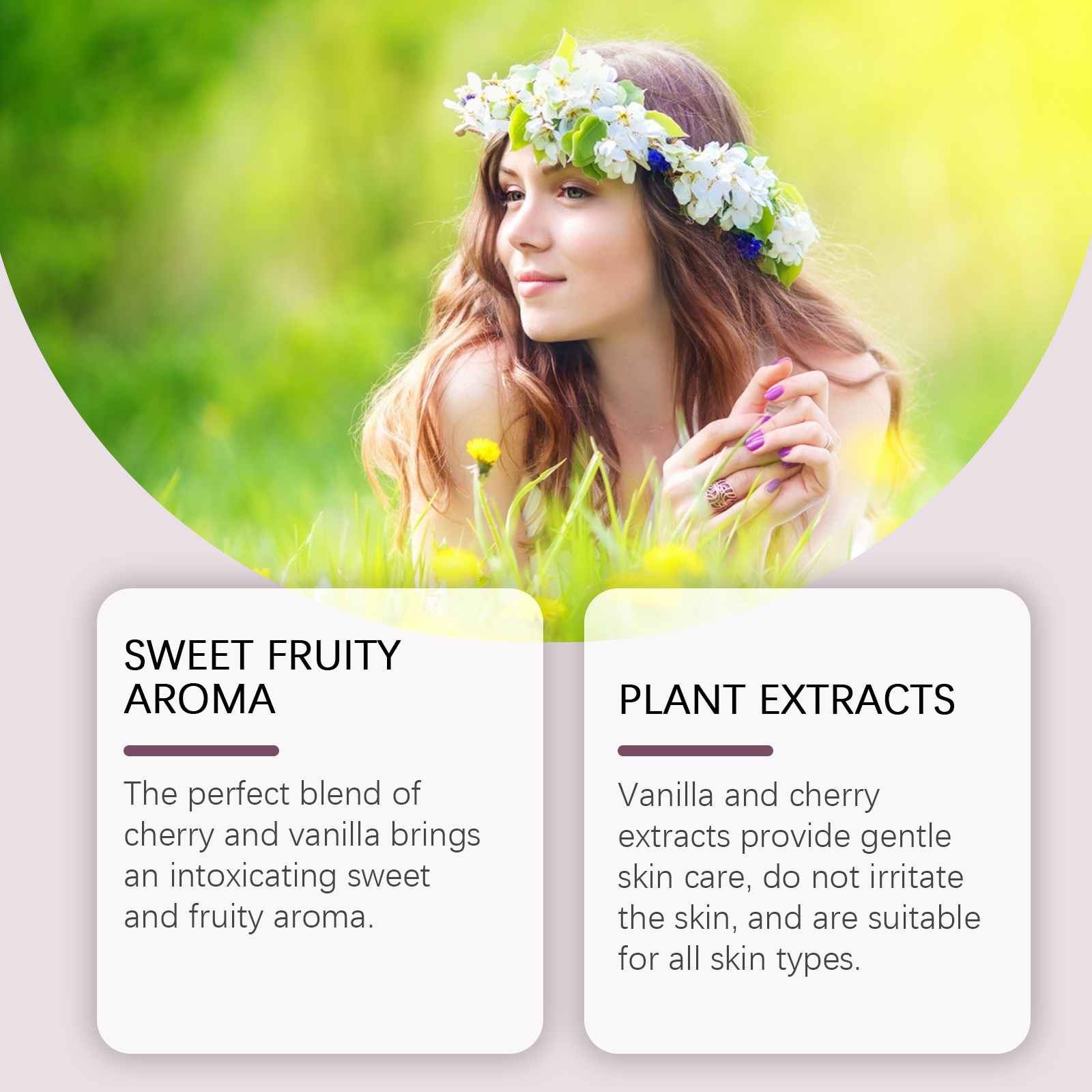 Our Cherry Vanilla Charm perfume contains glycerin, ethylhexyl glycerin. It has a long-lasting scent, and when you spray it in the morning, you'll feel confident and attractive all day long. Tangka bean extract increases the depth and richness of the aroma. Its application is simple: Use a rolling ball design to apply the perfume to the wrists, neck, behind the ears, knees and other pulse points. Use 1-2 times each time to achieve the best perfume distribution effect. The perfect blend of cherry and vanilla creates an intoxicating sweet fruit note. Vanilla and cherry extracts provide gentle skin care that does not irritate the skin and is suitable for all skin types.