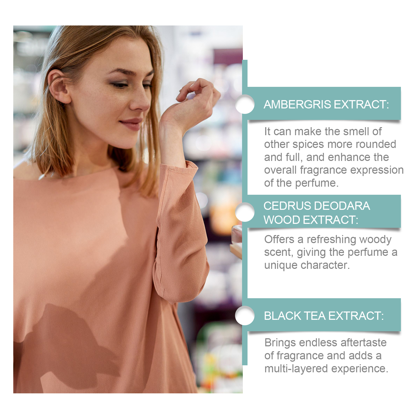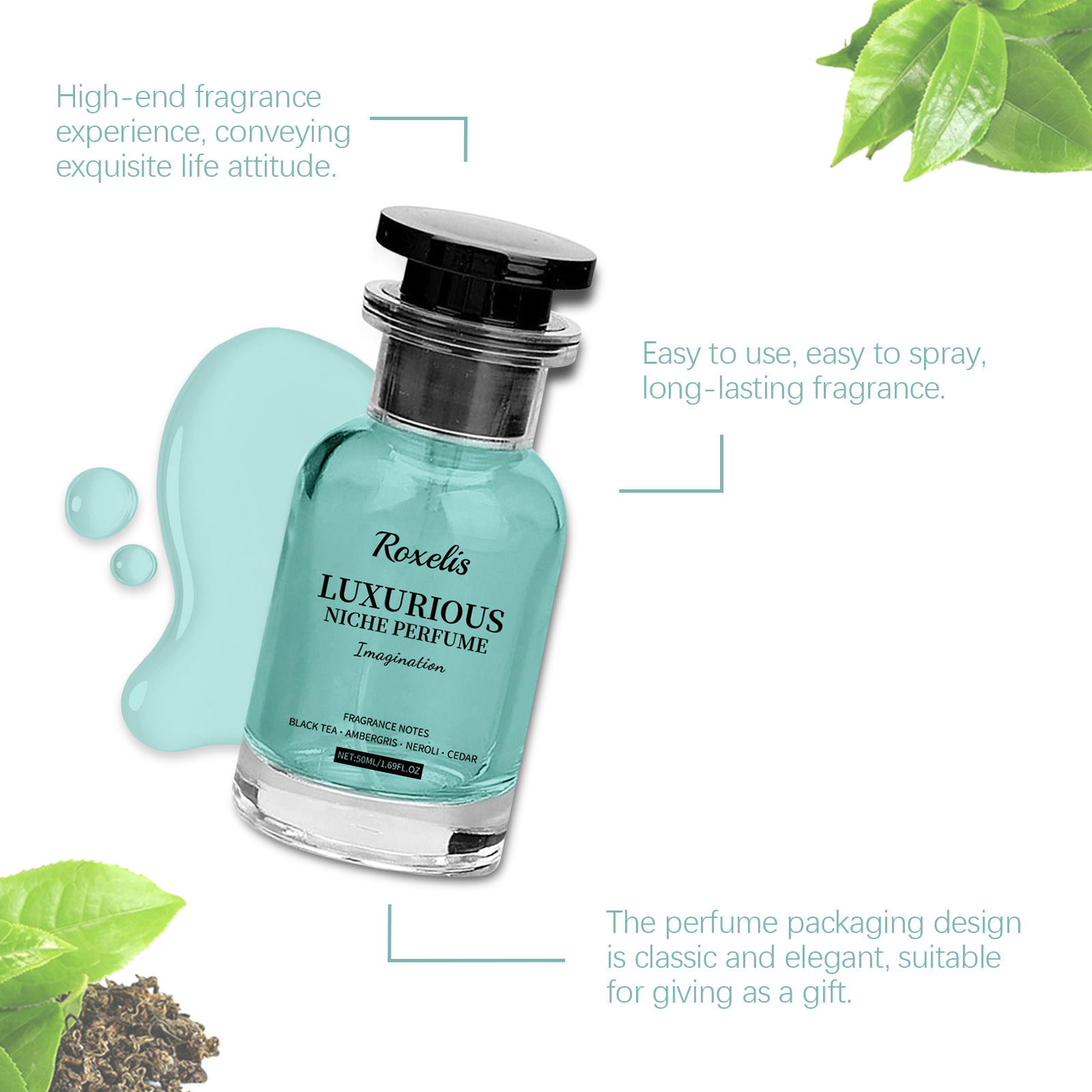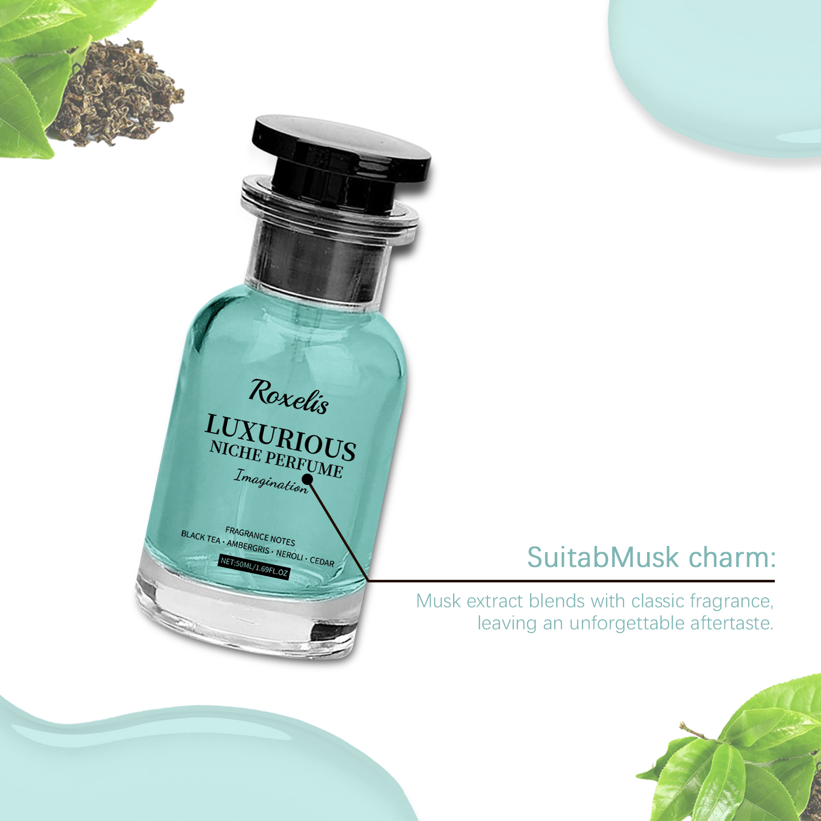 Our Ambergris niche perfume contains black tea extract, cedar wood extract and bitter orange blossom extract. It can offer a different feel, adding a sense of freshness and lasting charm. Its application is simple: 1. Lightly spray the perfume on the wrists, neck, chest and other pulse points; 2. Spray 1-2 times each time to achieve the best margin spread effect. Its unique aroma, mixed with notes of wood and sea, adds an incomparable nobility to the perfume. Give the perfume a warm and deep wood scent, showing the mature charm of men.